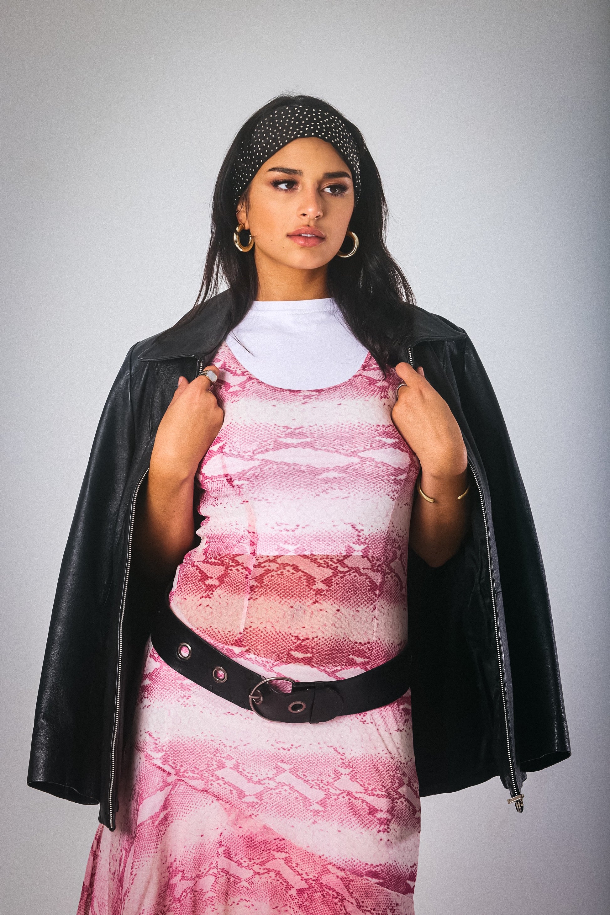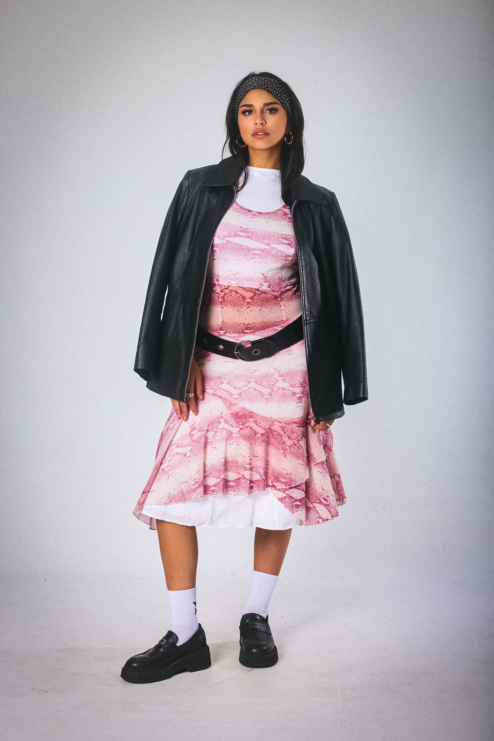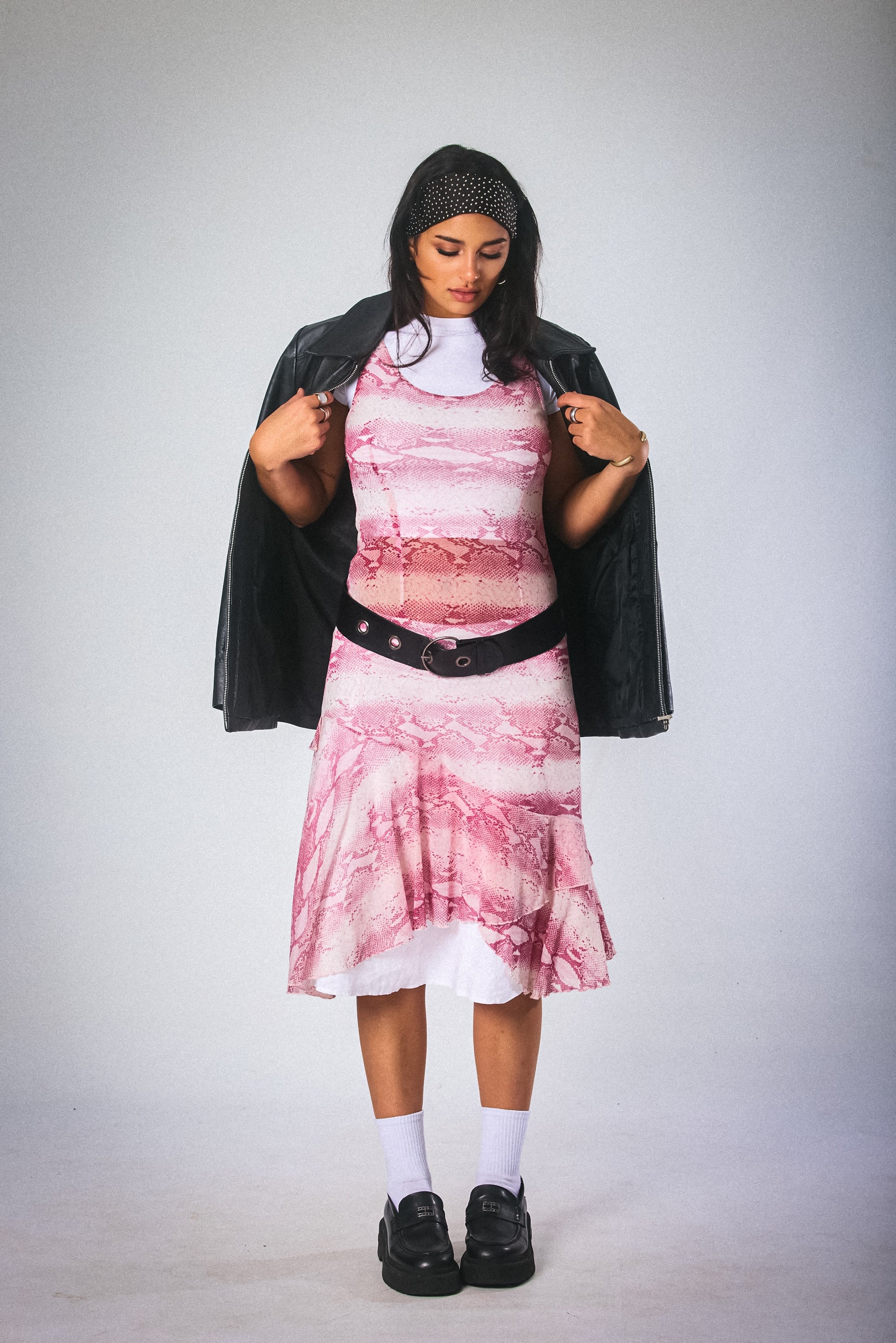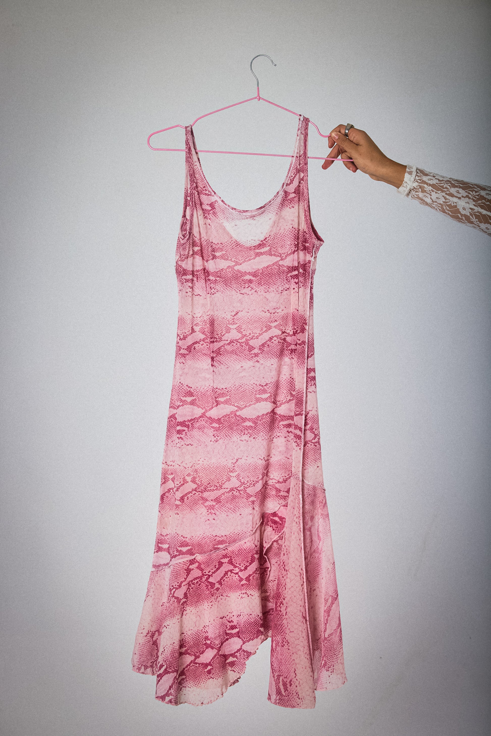A striking vintage mesh slip dress featuring a soft pink python print and subtle flared hem. Lightweight and semi-sheer with a gentle drape, this piece flatters the silhouette and offers versatile styling — whether layered over a tee or worn on its own. A timeless statement with a modern edge. One-of-a-kind.