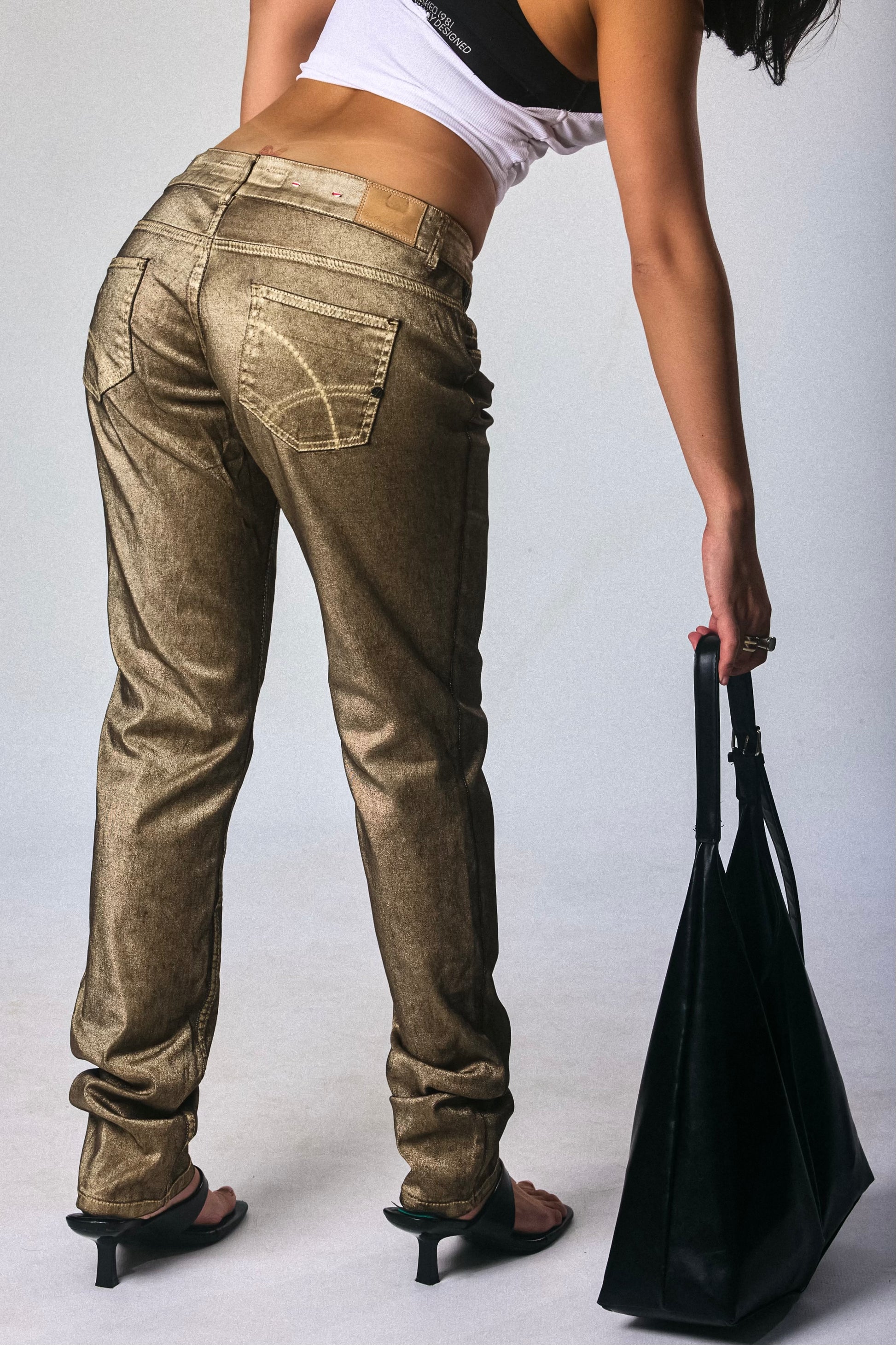 Low-rise, high drama. These metallic gold jeans serve early 2000s energy with a dirty shimmer finish and a slouchy fit that stacks just right. Pair with heels, layers, or nothing at all—these pants carry the look.