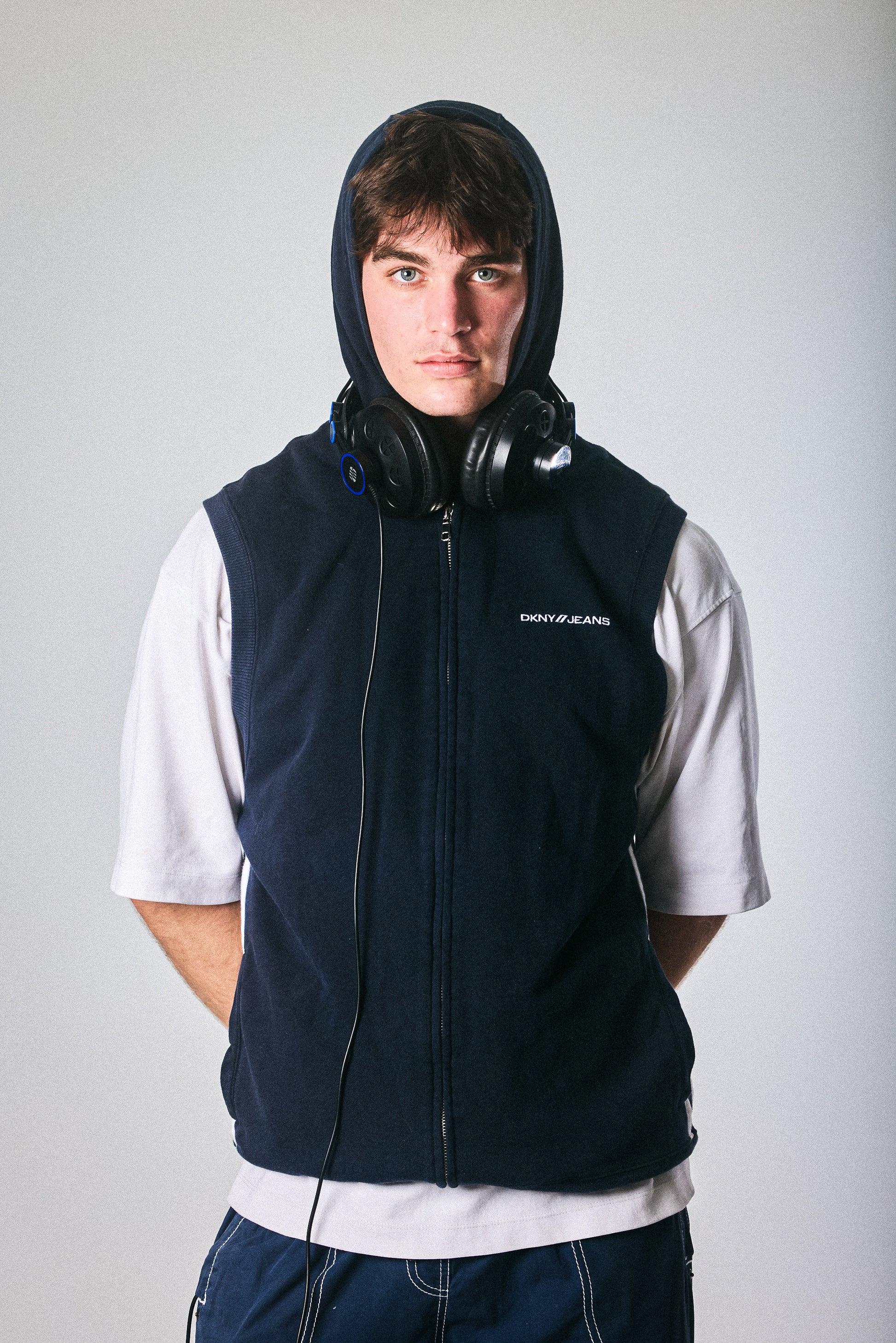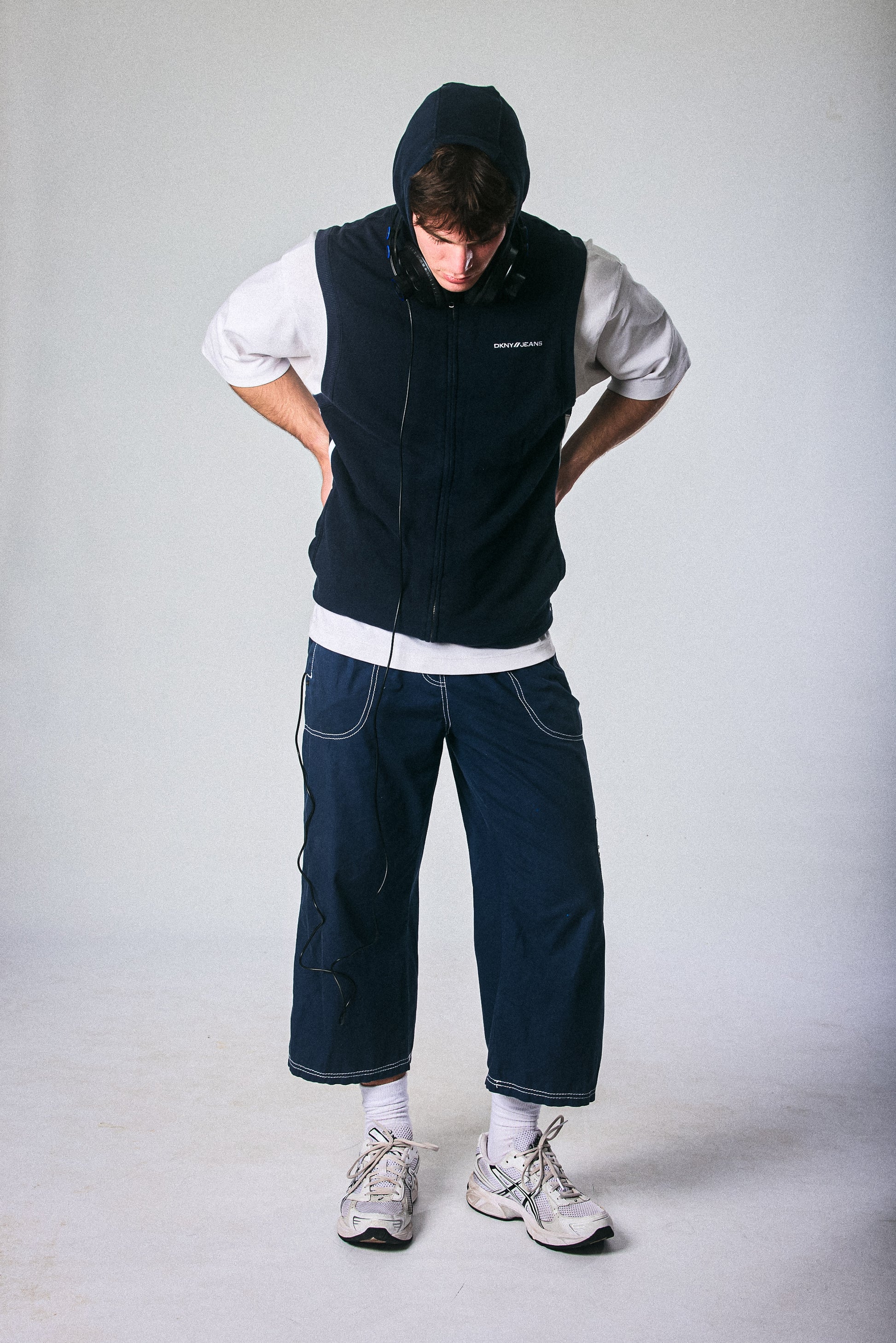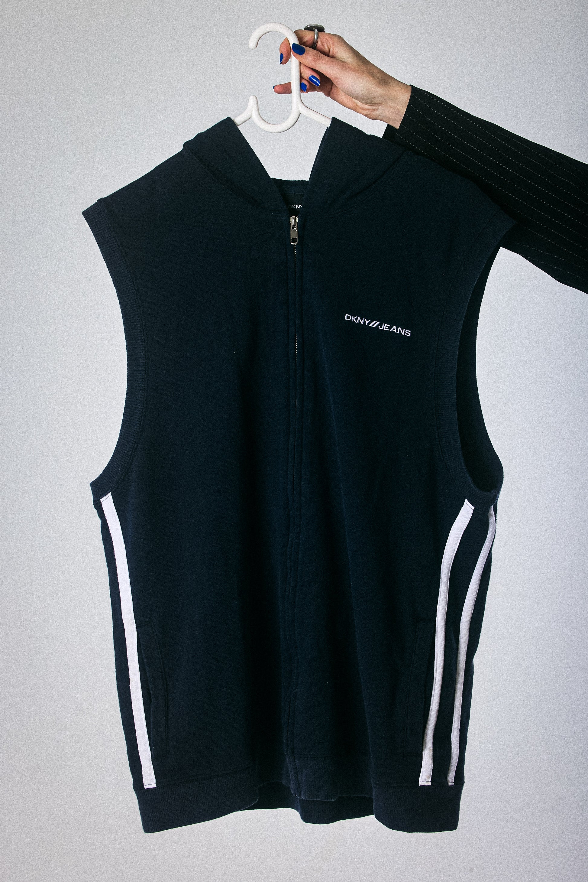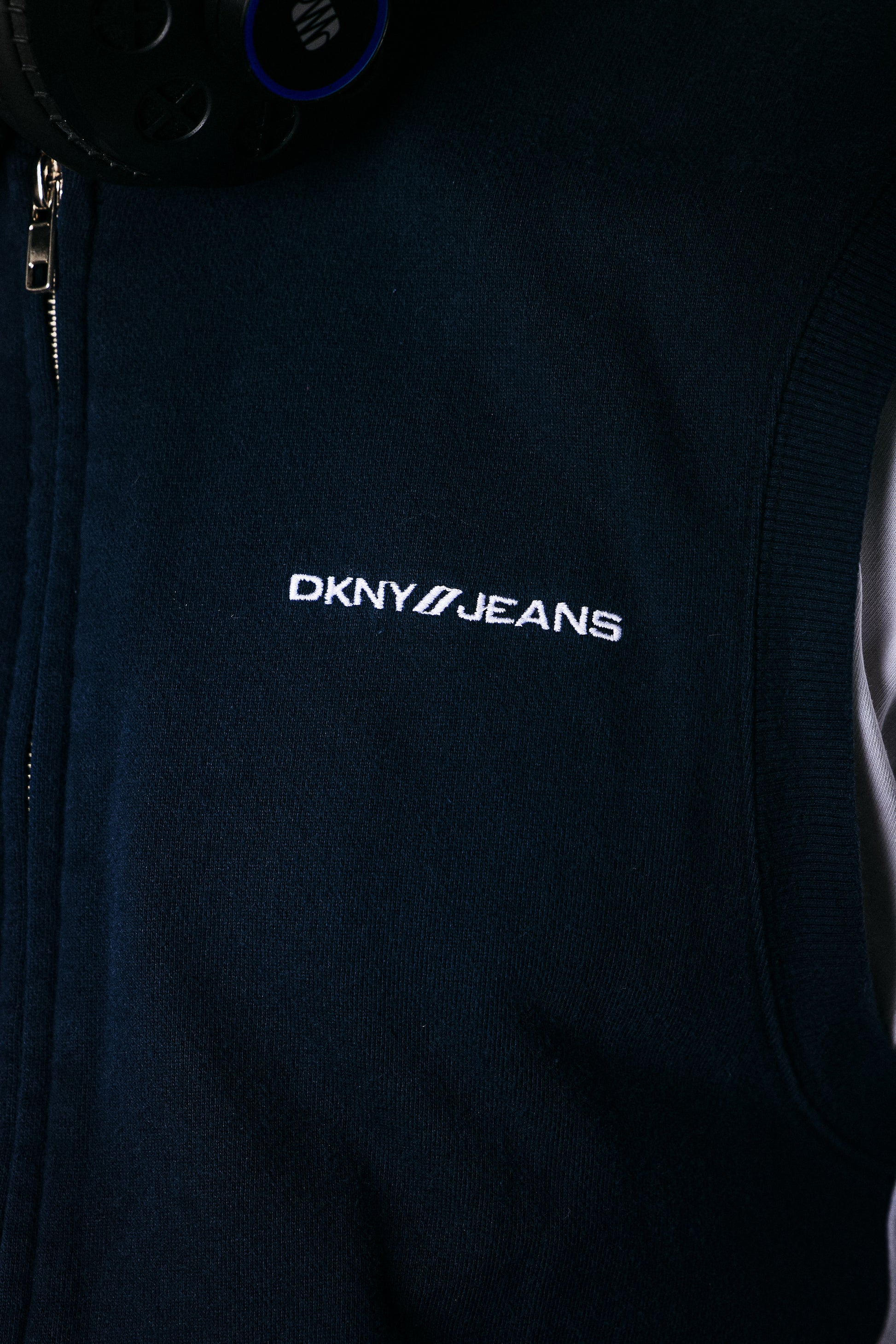 Original DKNY JEANS sleeveless zip vest in deep navy. Sporty cut with side stripe detail and front logo embroidery. Fleece-like inner for softness, and streetwear-ready silhouette. Unisex, late ‘90s coded, headphone optional.
