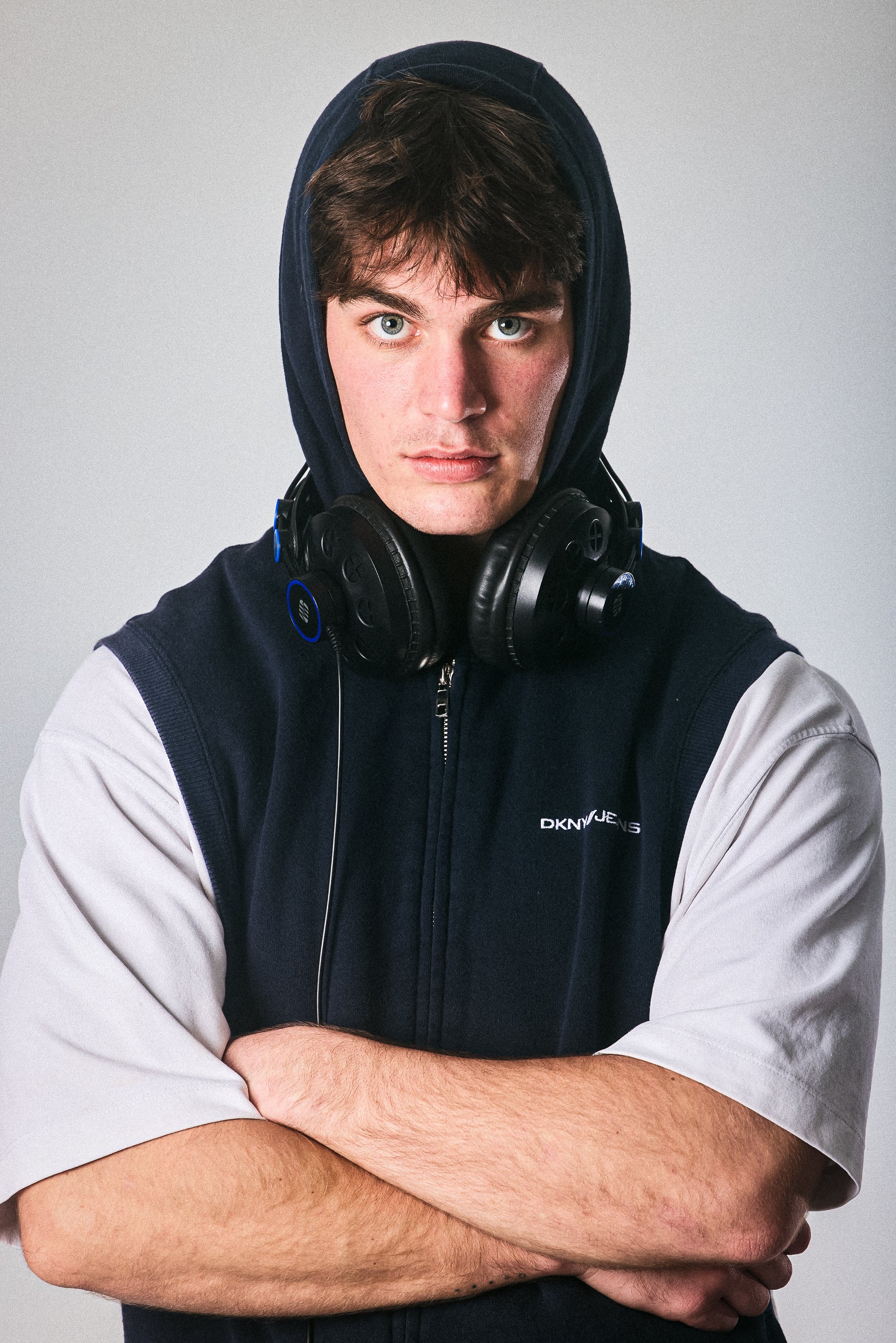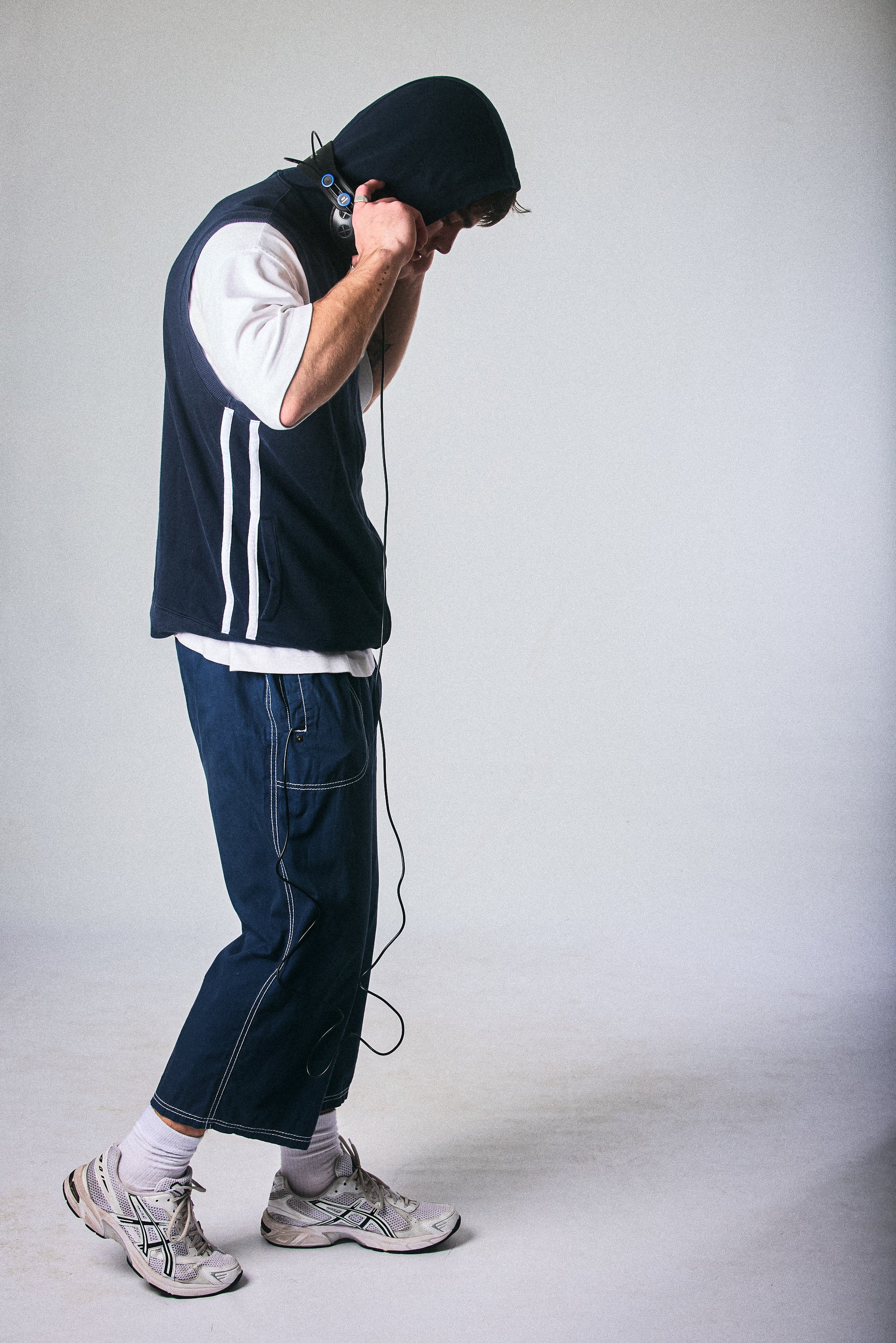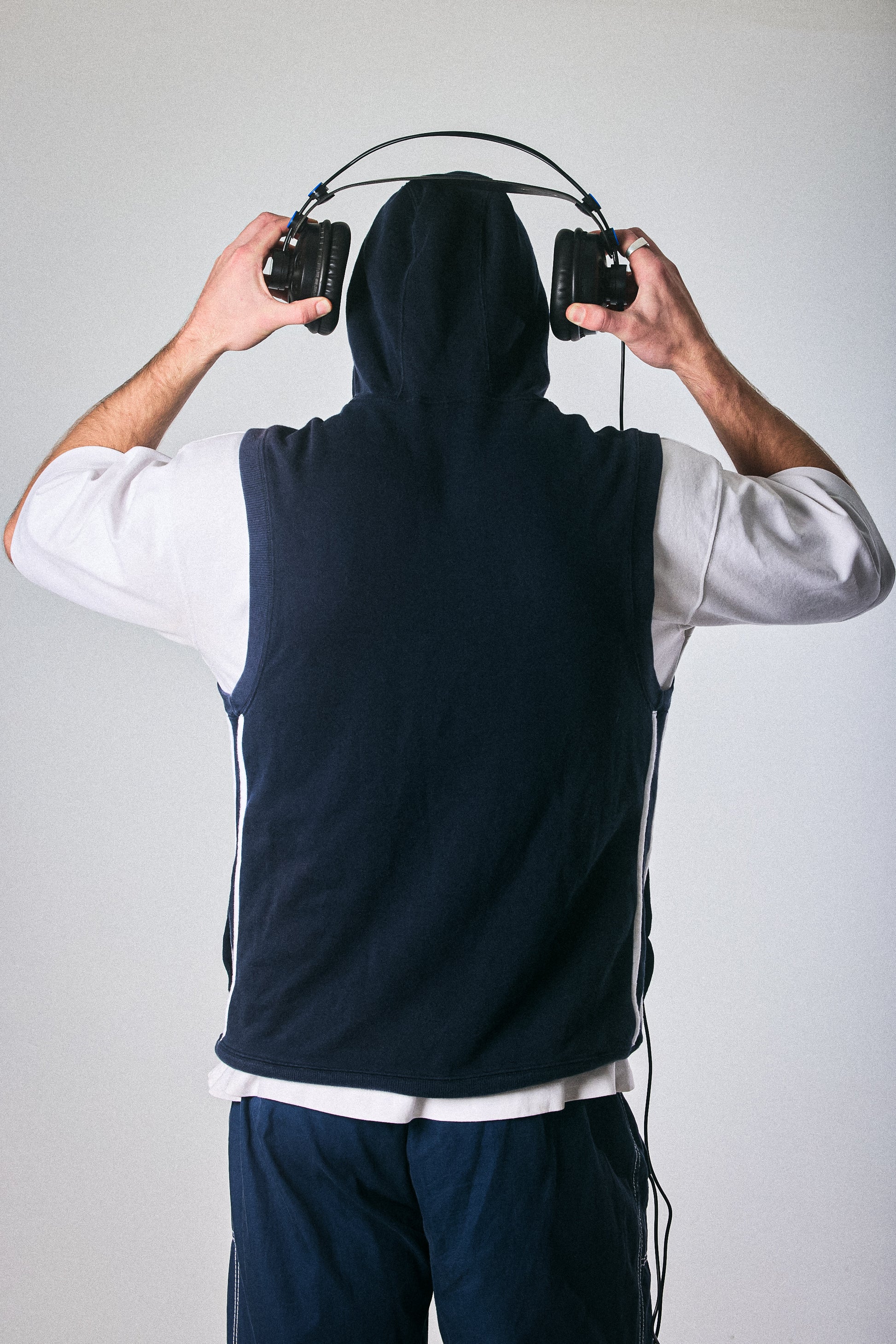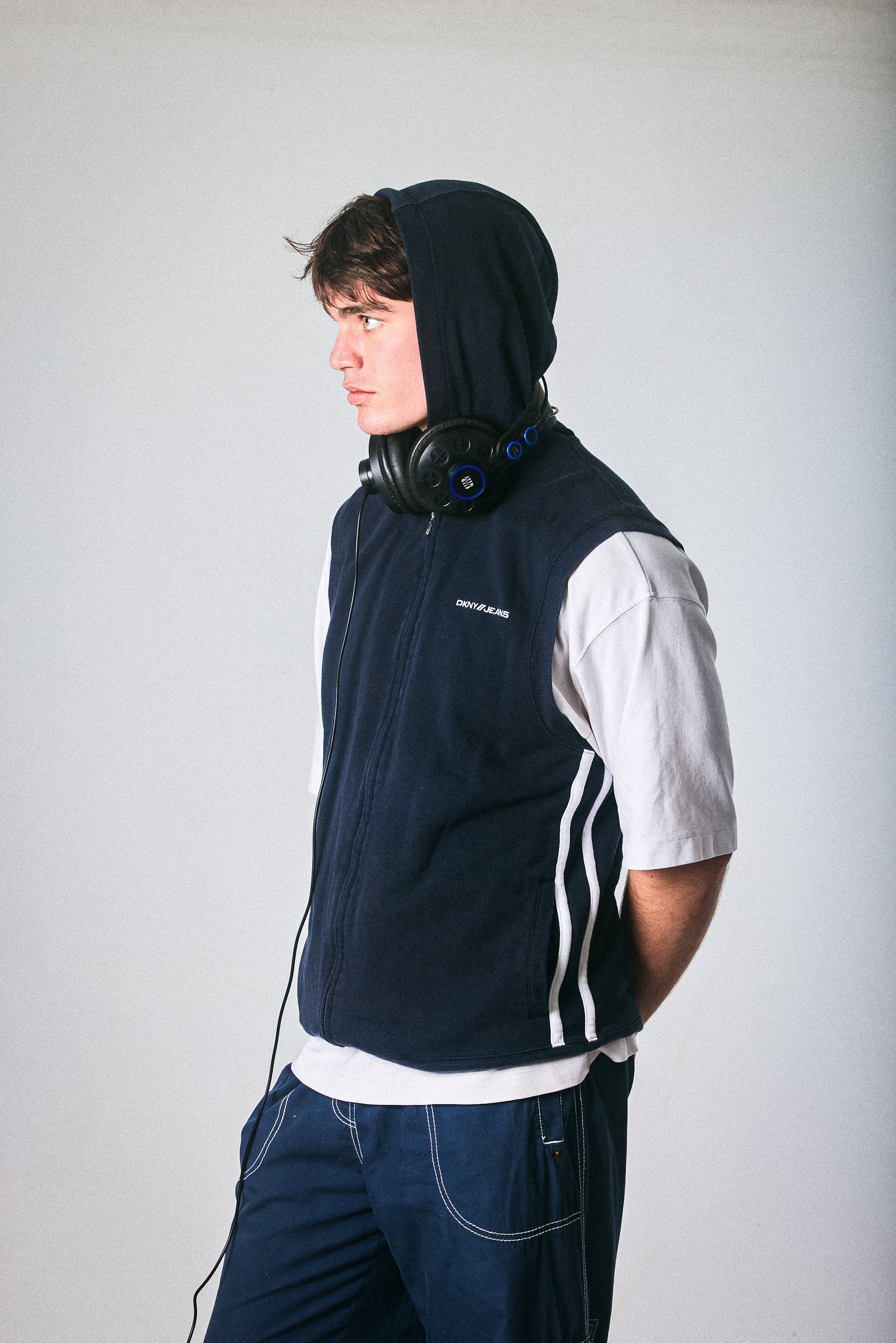 Original DKNY JEANS sleeveless zip vest in deep navy. Sporty cut with side stripe detail and front logo embroidery. Fleece-like inner for softness, and streetwear-ready silhouette. Unisex, late ‘90s coded, headphone optional.