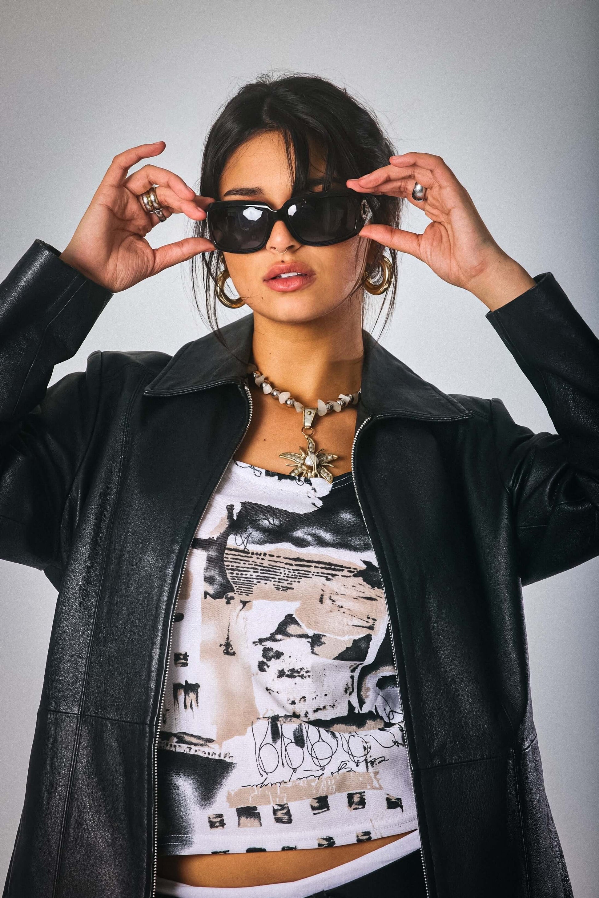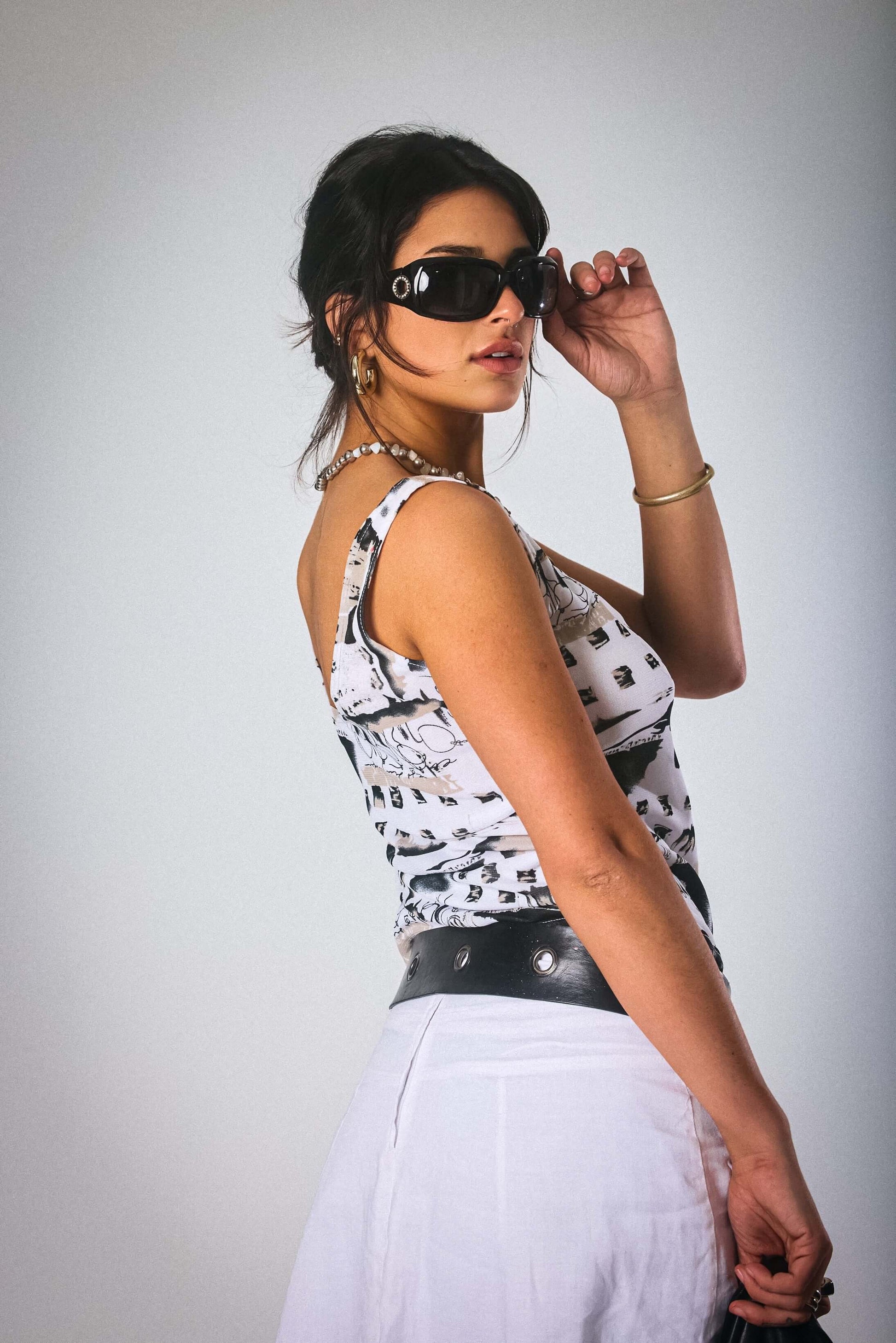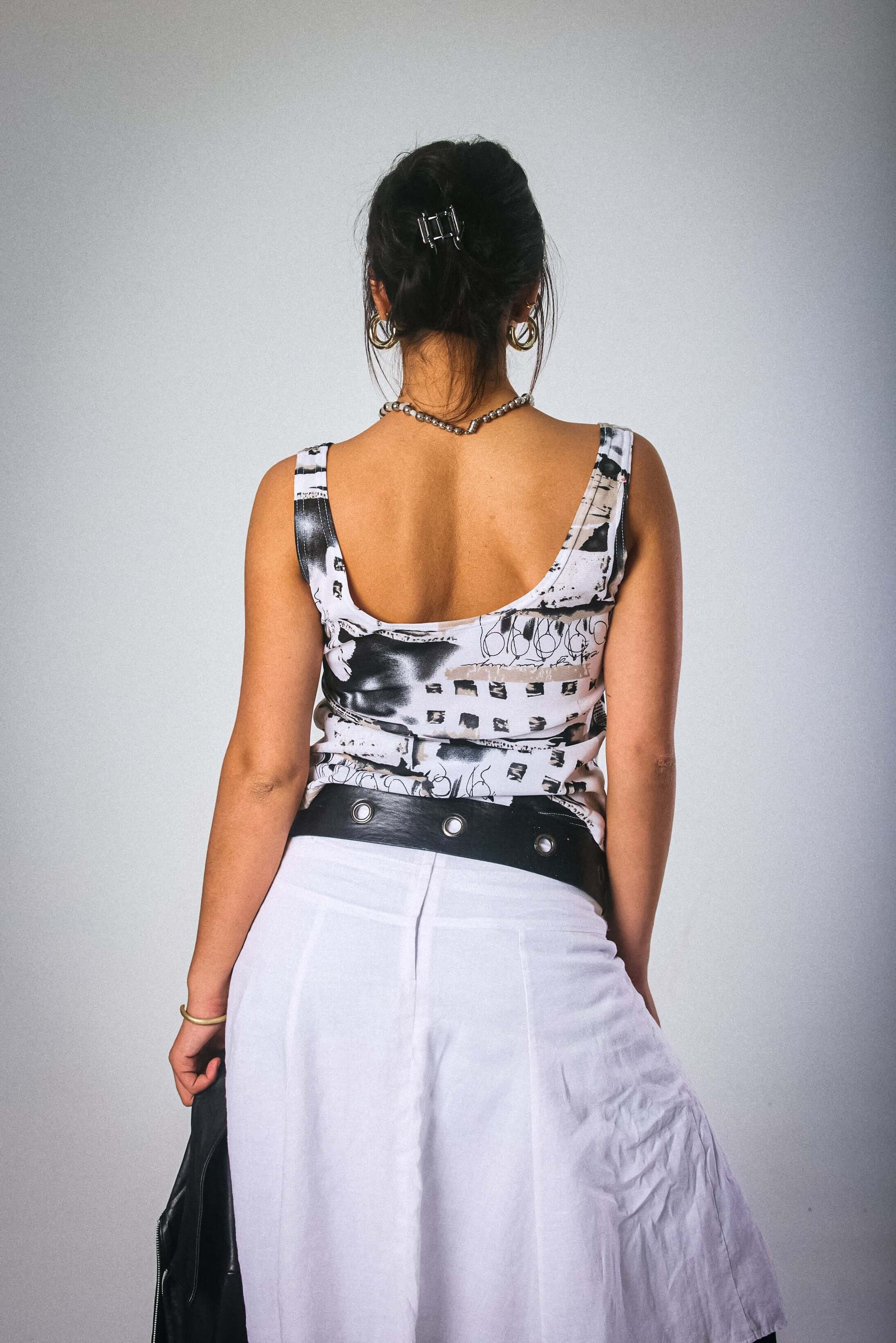The ultimate Y2K baddie basic. This stretch-fit tank top features an abstract grayscale graphic with handwritten accents, giving it that perfect edgy-art-girl energy. Pair with low-rise anything and chaotic accessories.