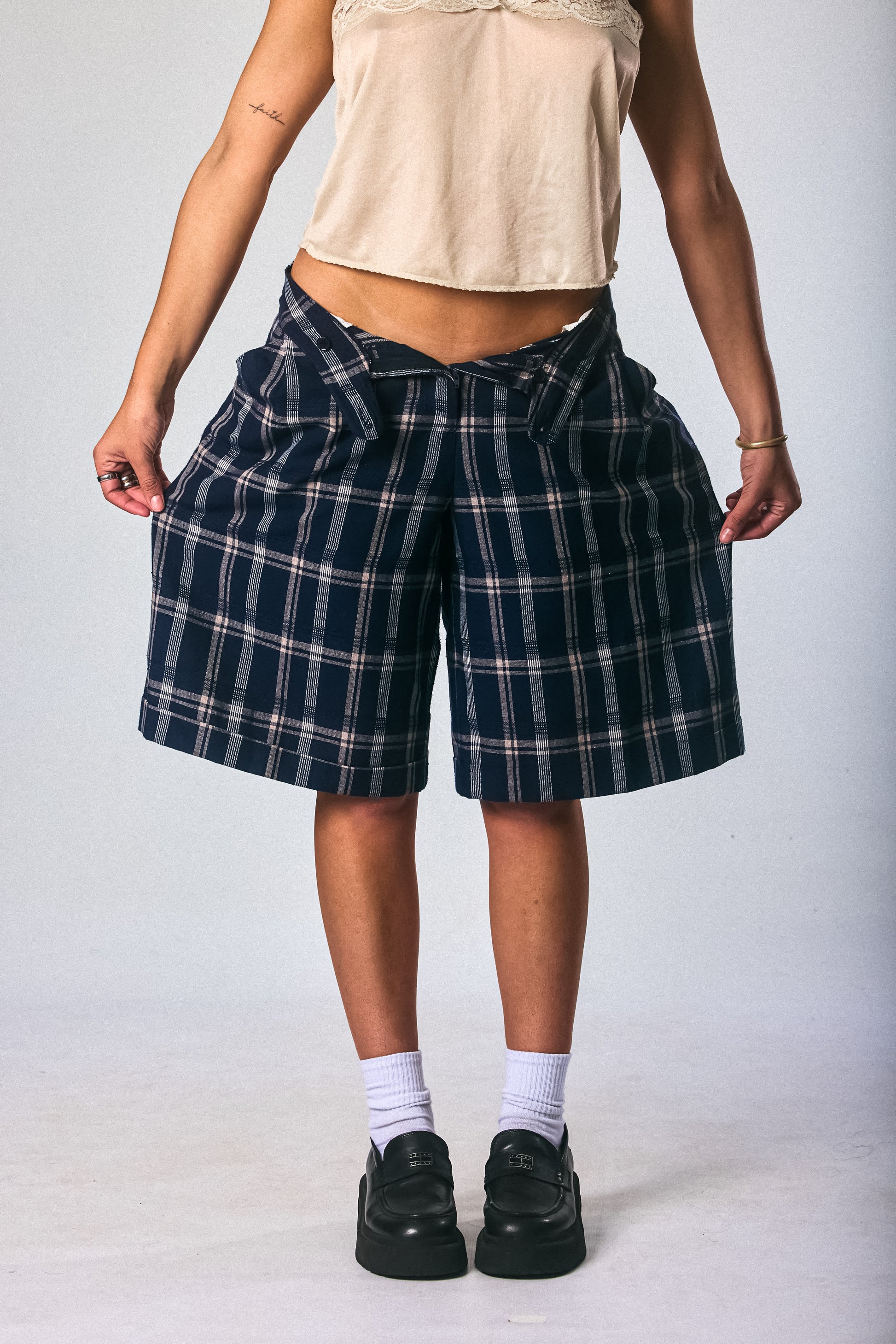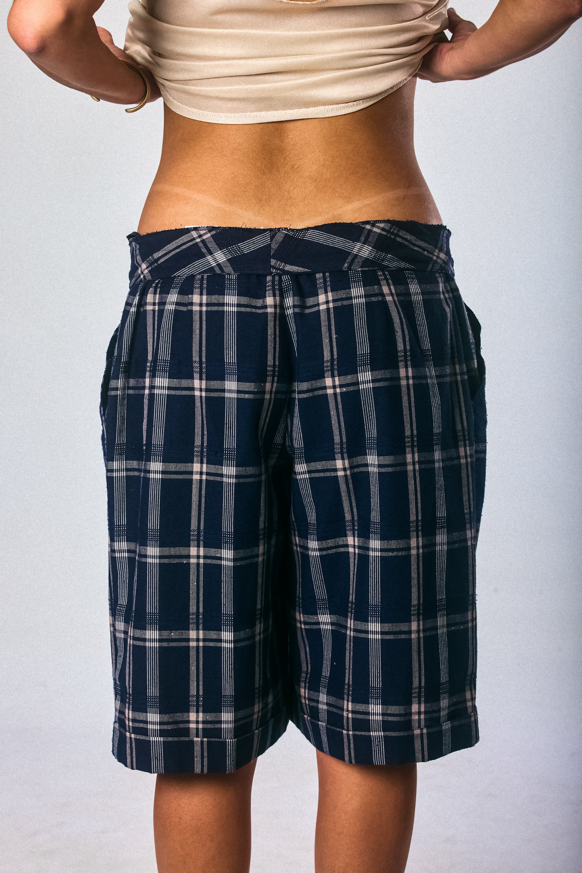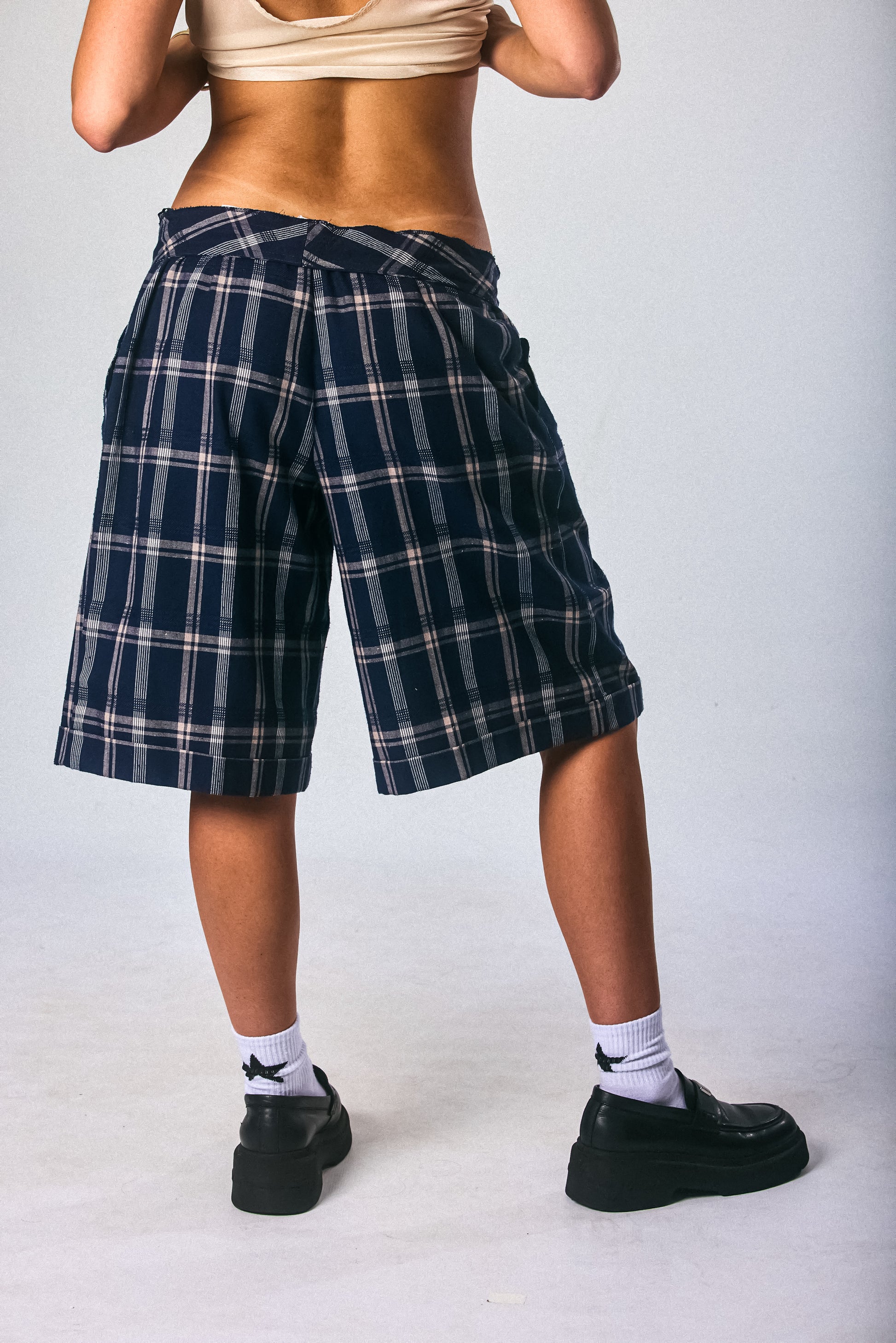 Slouchy plaid bermudas with a wide leg and low-rise cut—built for baggy drama. Navy base with muted stripe detailing, belt loops, and enough room to make a statement. Genderless. Attitude required.