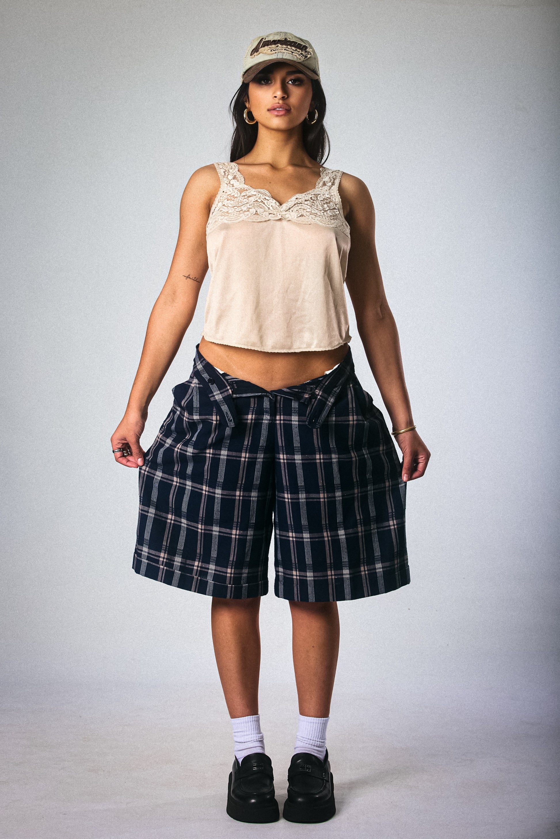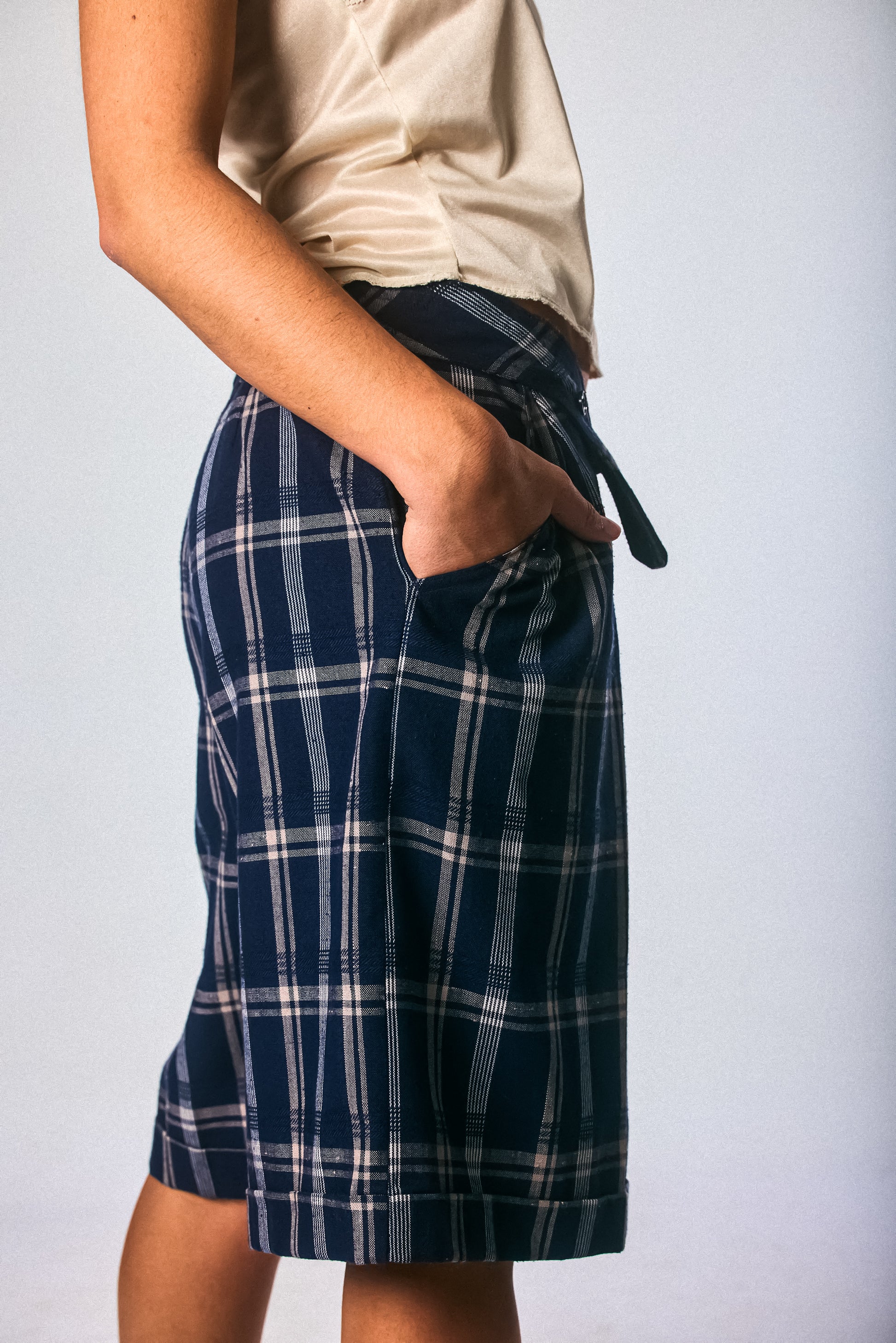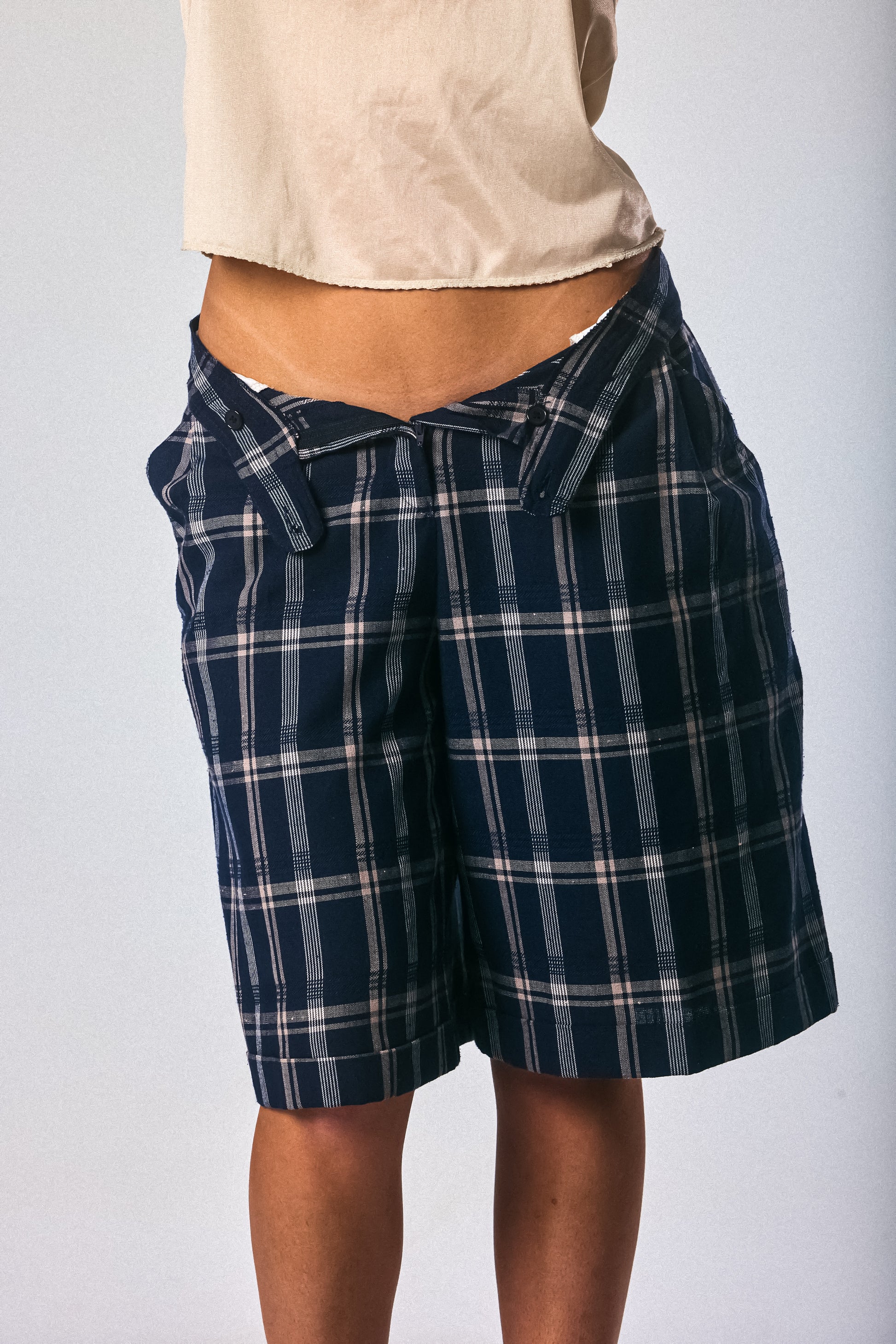 Slouchy plaid bermudas with a wide leg and low-rise cut—built for baggy drama. Navy base with muted stripe detailing, belt loops, and enough room to make a statement. Genderless. Attitude required.