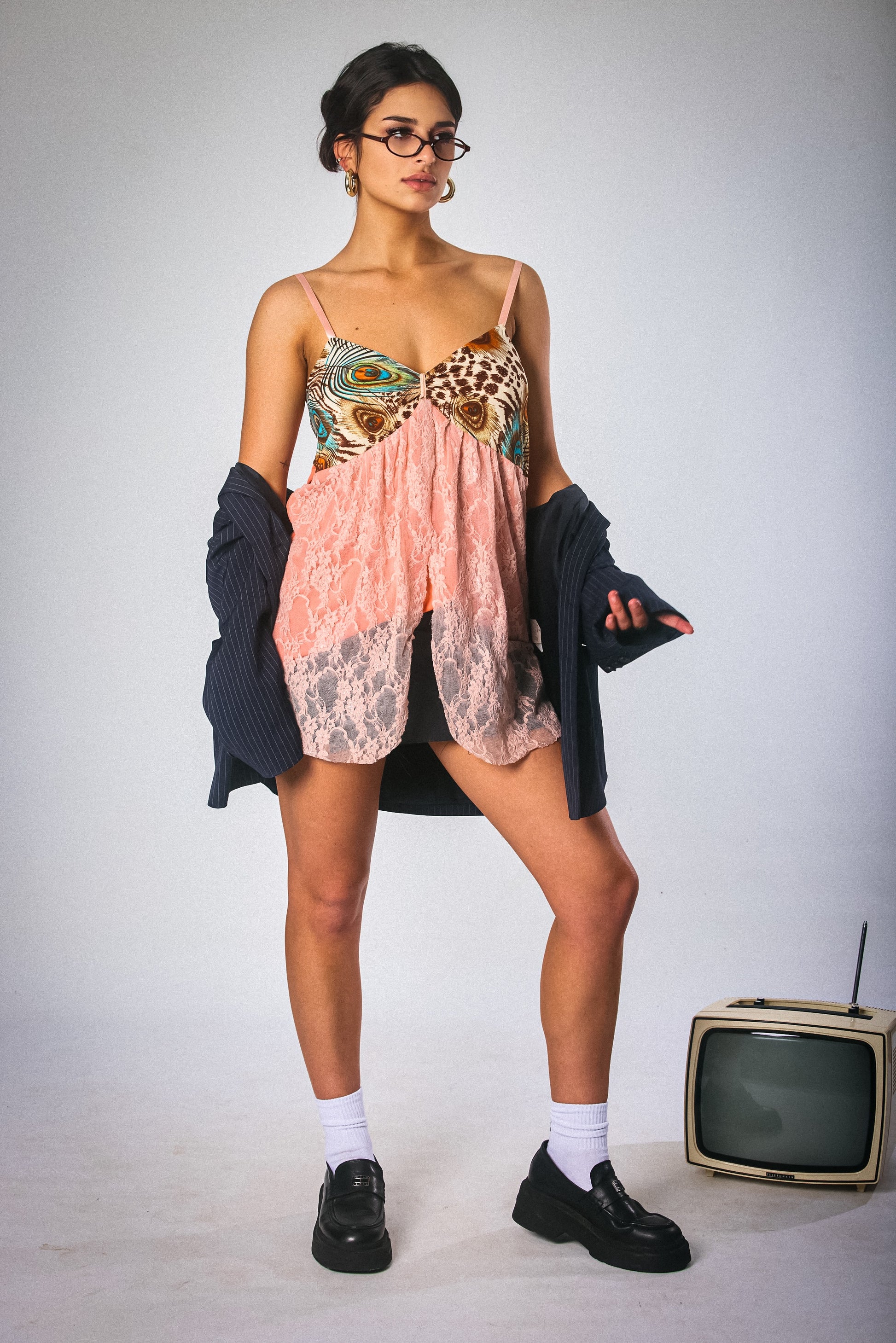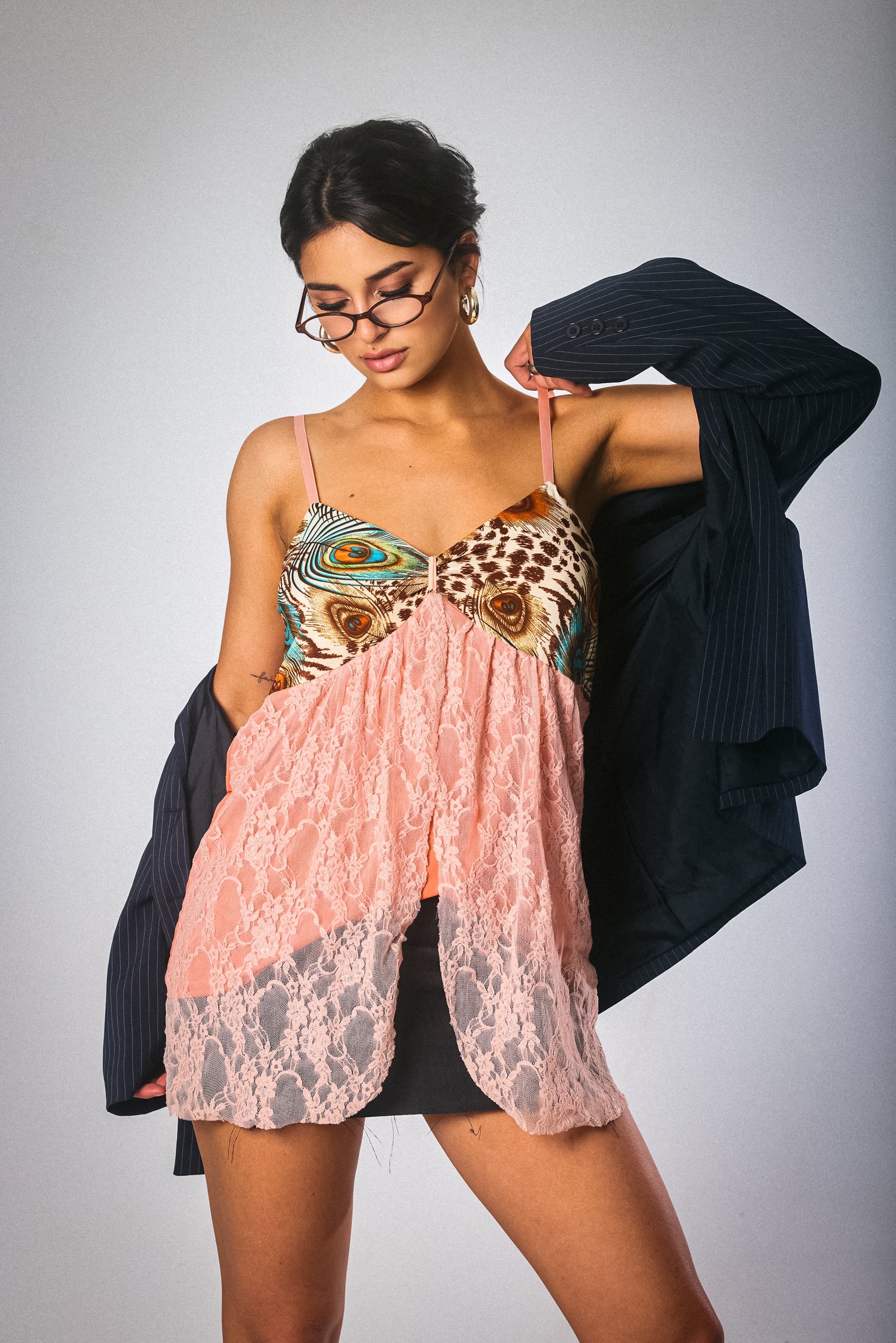 A rare and whimsical vintage camisole featuring a striking animal-and-feather print bust with delicate blush lace overlay. Thin straps and a flowy, sheer finish make it perfect for layering or wearing as a bold statement on its own. Equal parts flirty and unhinged — for the girl who’s never just one thing.