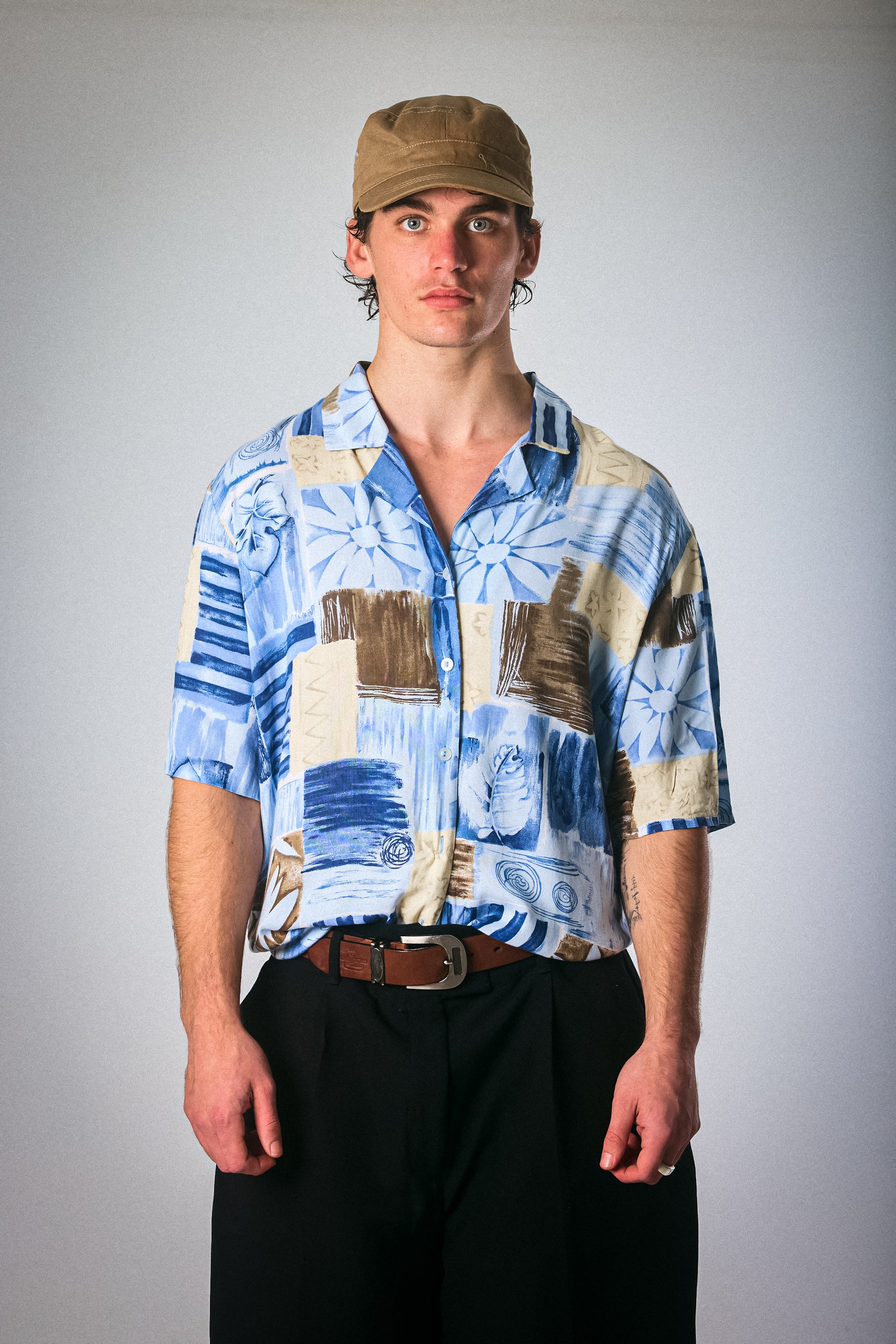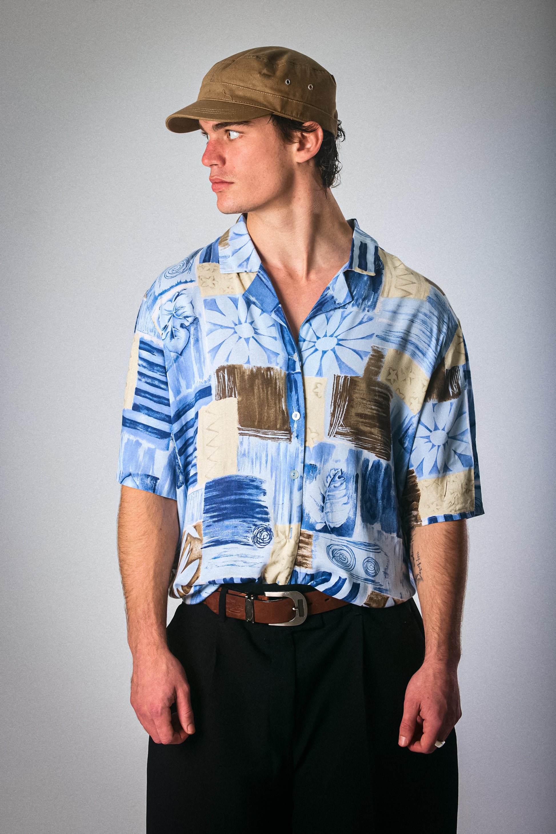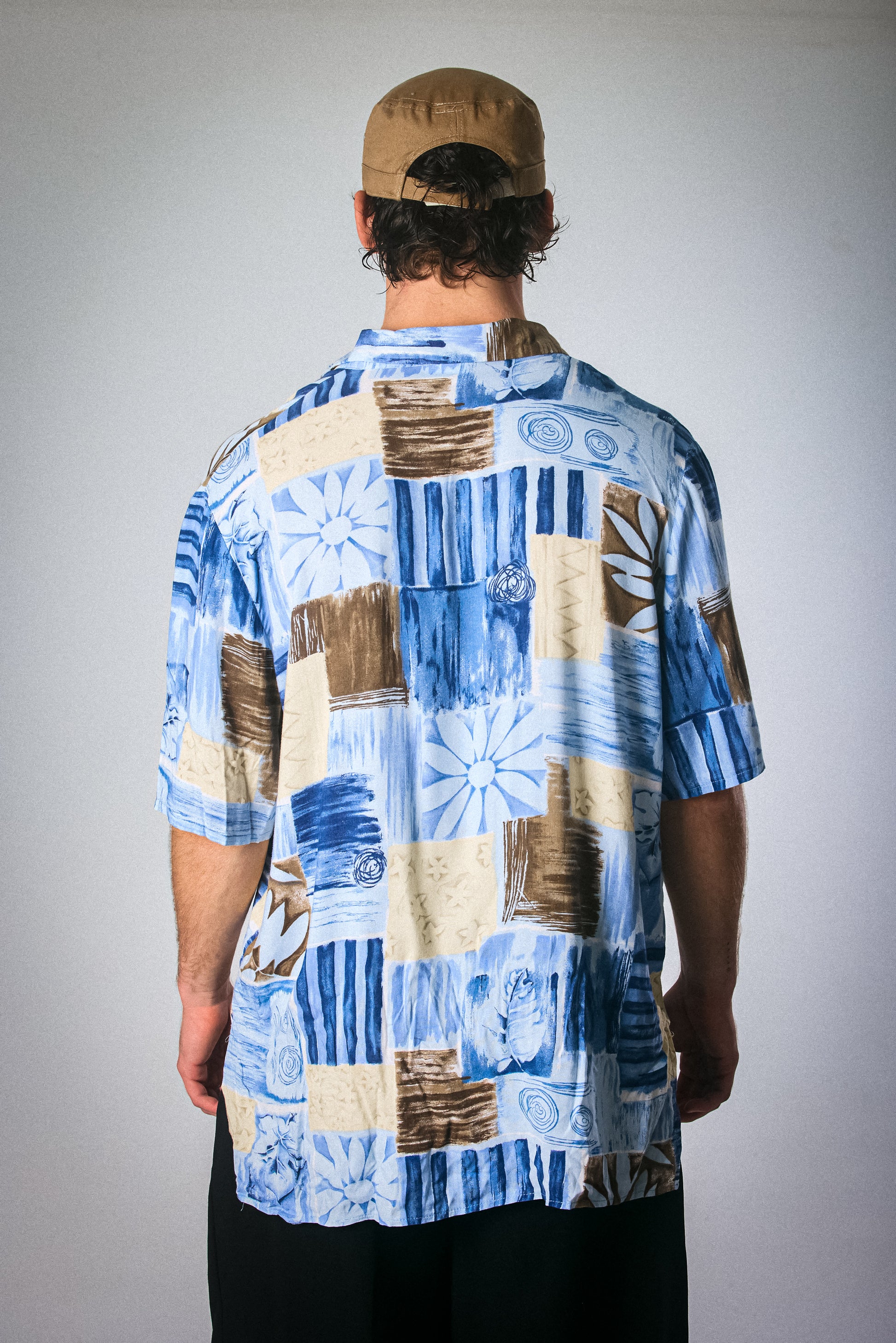 A lightweight short-sleeve vintage button-down in a palette of ocean blues, sandy beige, and espresso brown. Features an abstract floral and textural print that feels like summer on film. Soft, relaxed fit with that effortless worn-in charm. Ideal for beach days, lazy errands, or stealing the show at a backyard braai.