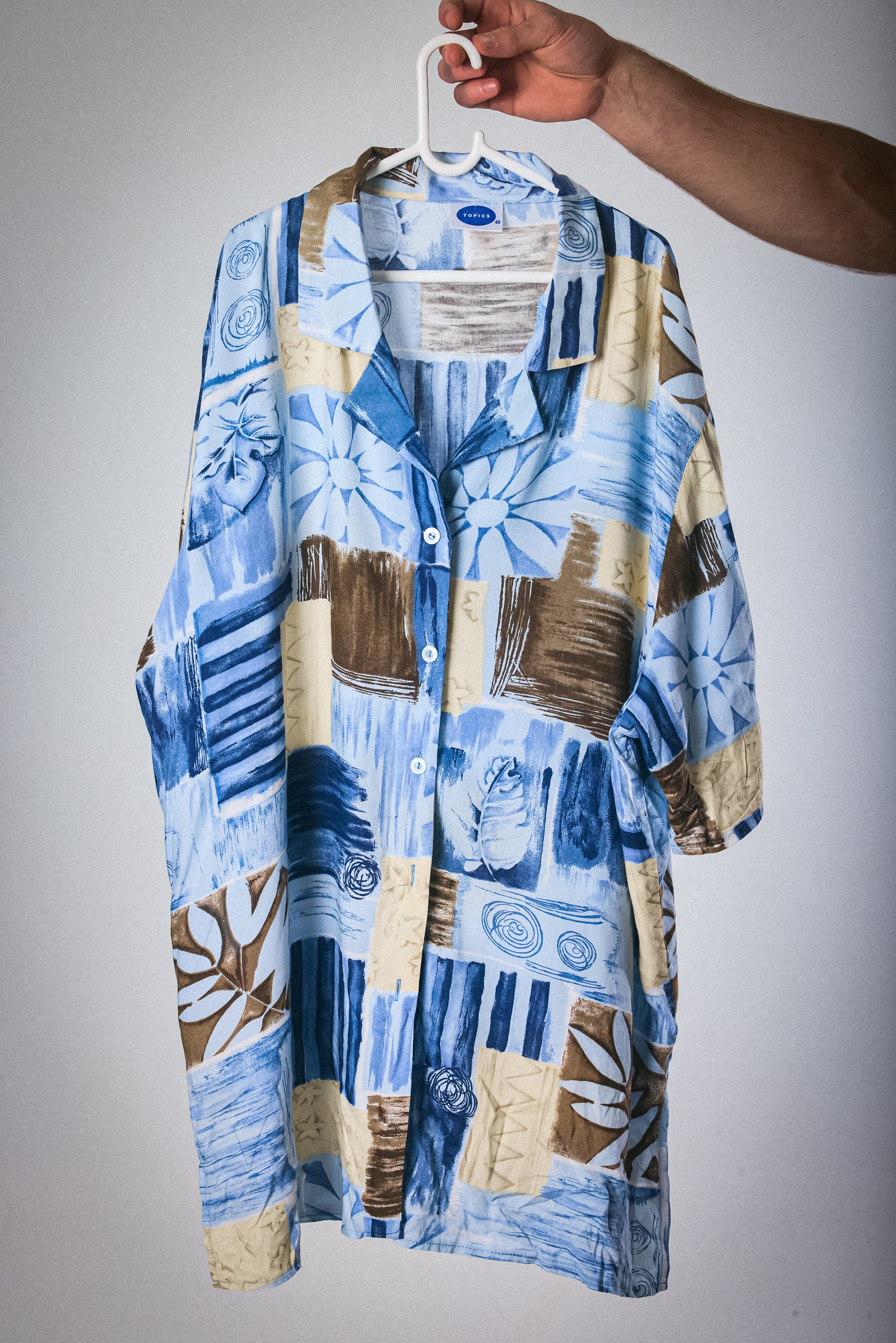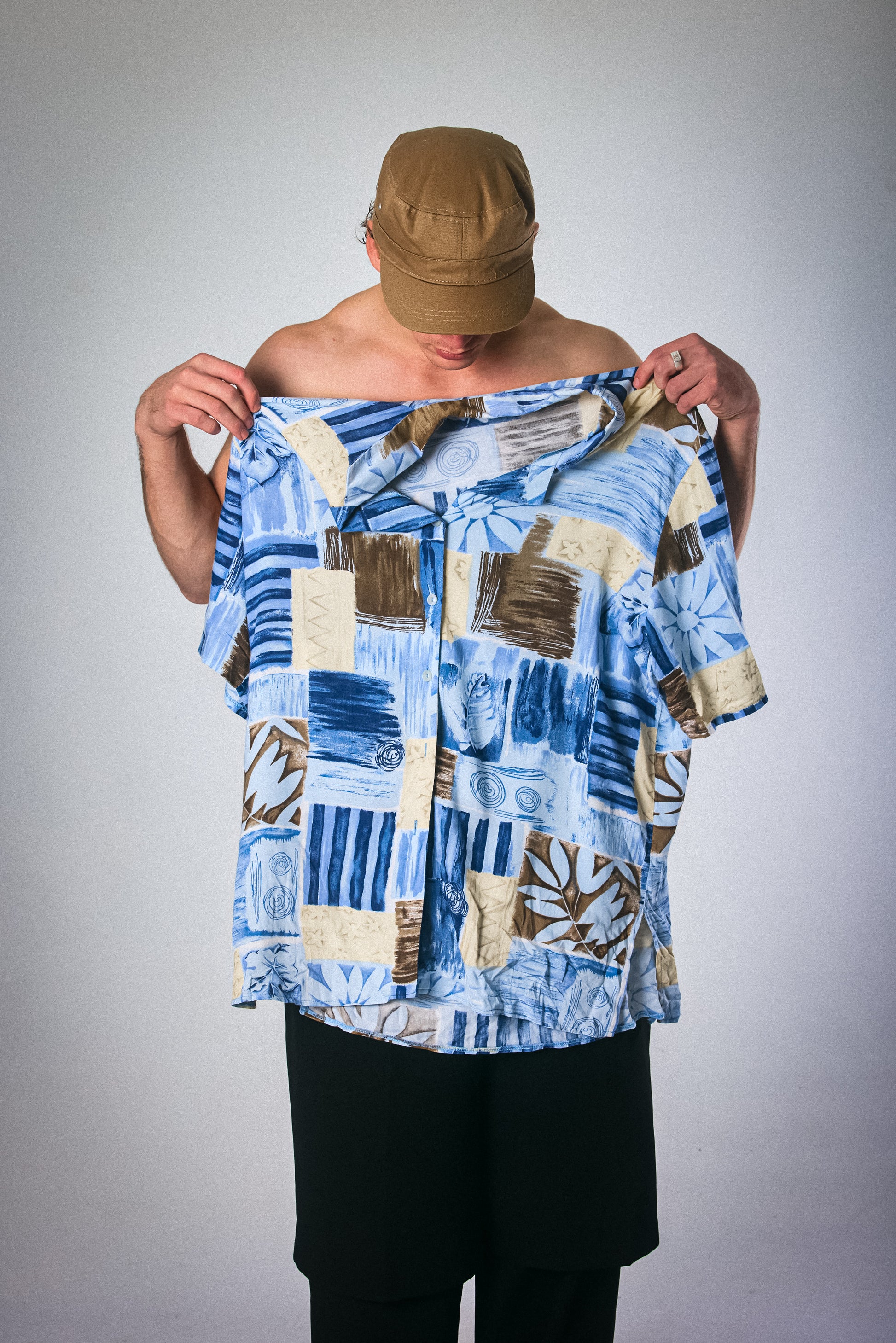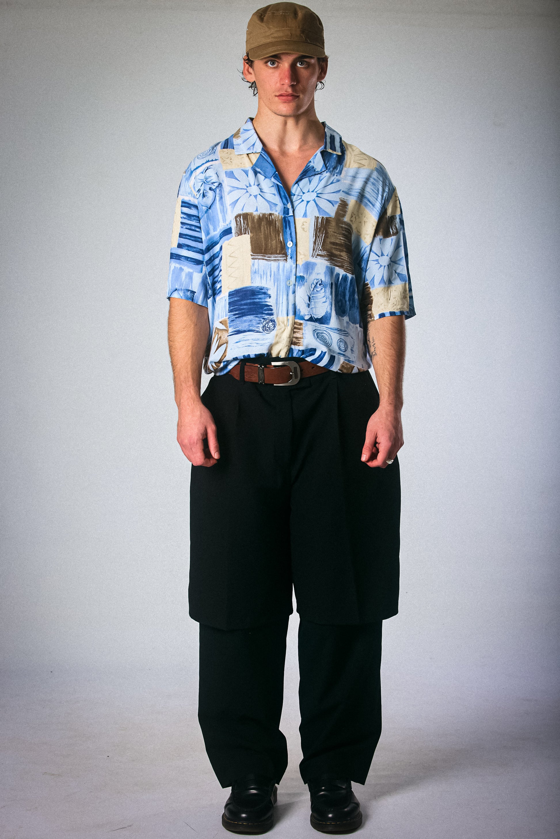 A lightweight short-sleeve vintage button-down in a palette of ocean blues, sandy beige, and espresso brown. Features an abstract floral and textural print that feels like summer on film. Soft, relaxed fit with that effortless worn-in charm. Ideal for beach days, lazy errands, or stealing the show at a backyard braai.