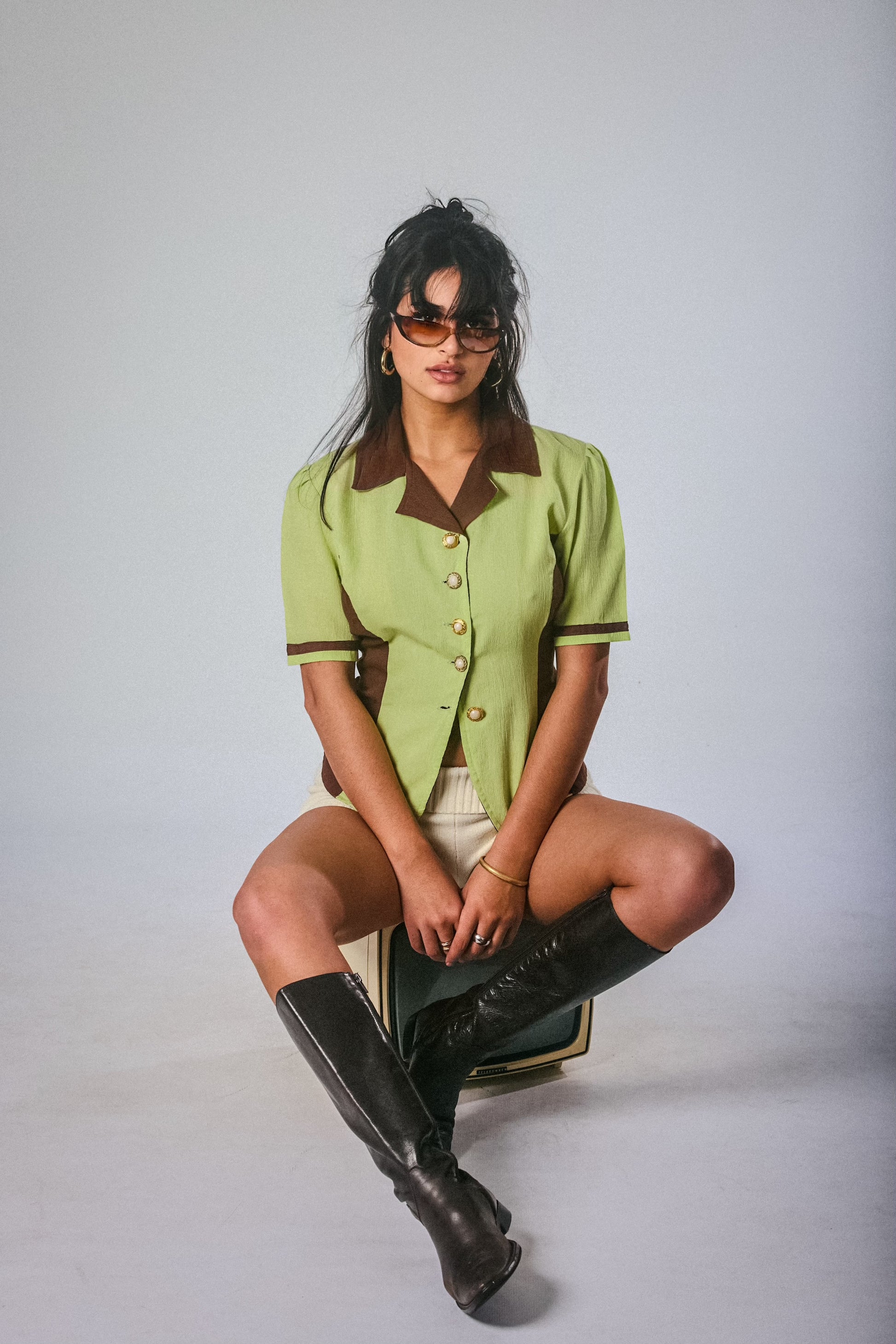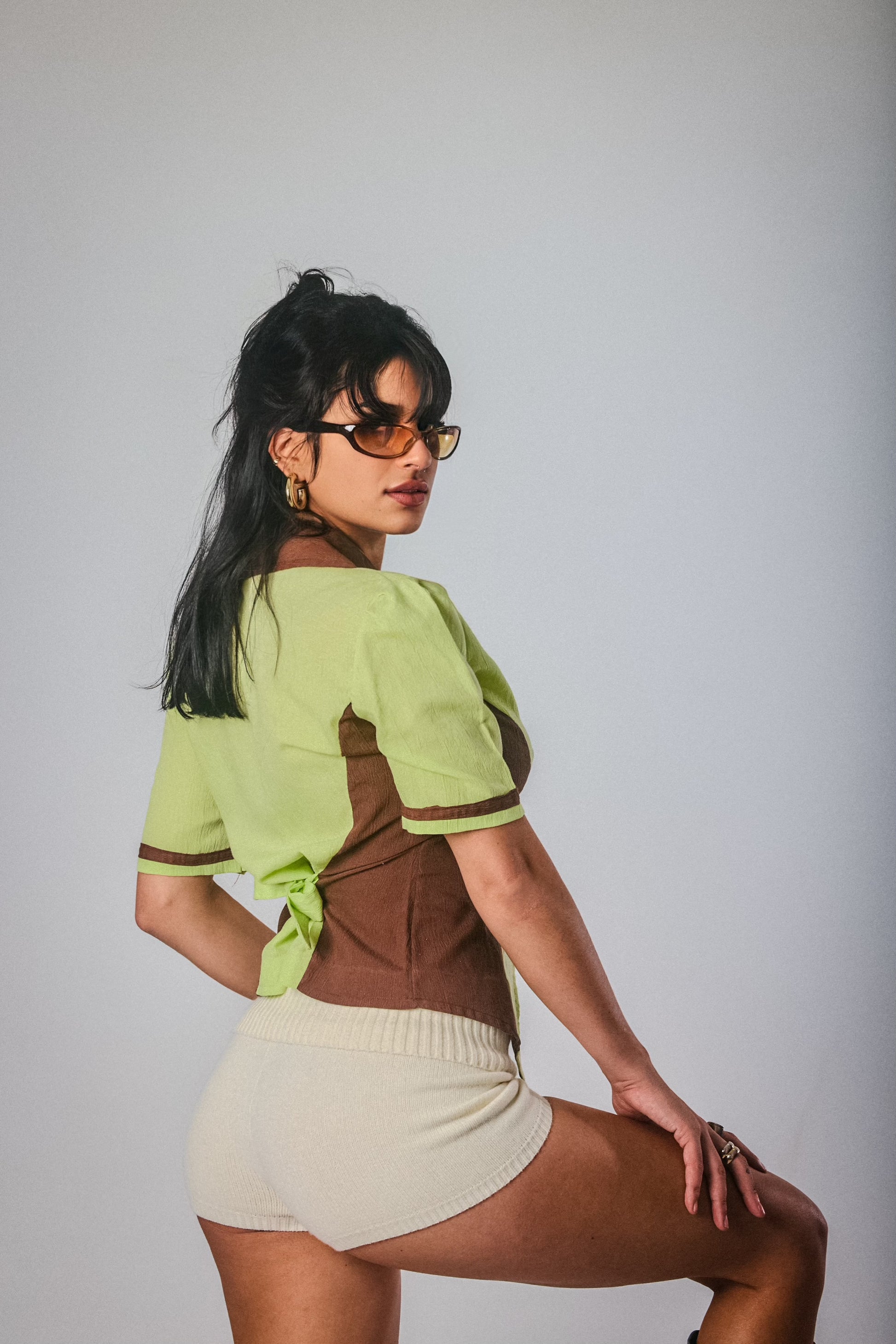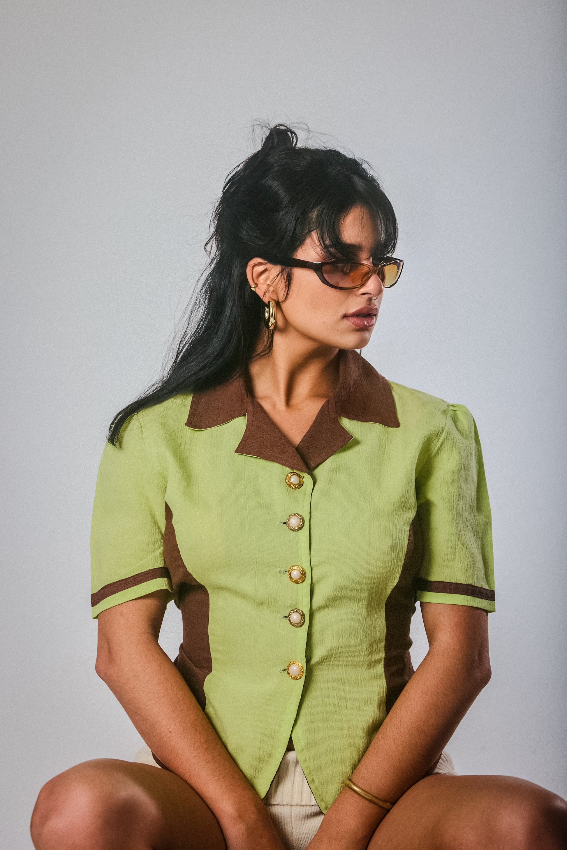 This structured two-tone shirt gives Y2K business baddie. Featuring gold pearl buttons, brown contrast panelling, and a tailored waist for a snatched fit. She’s vintage, she’s chic, she’s sharp—pair with cargos or knee-highs.