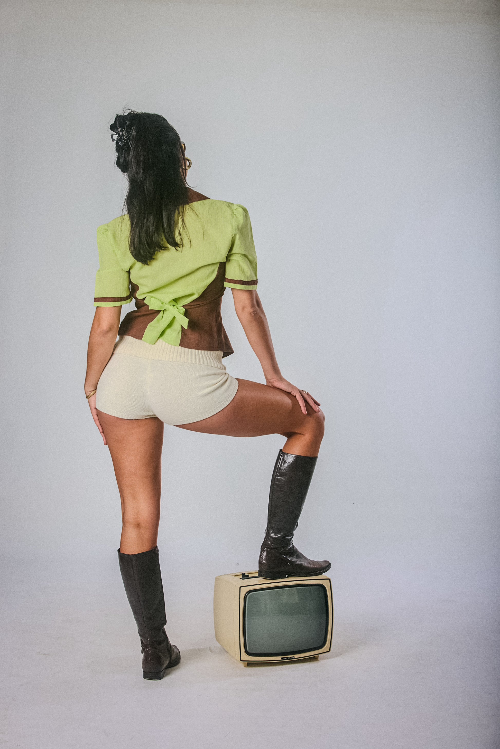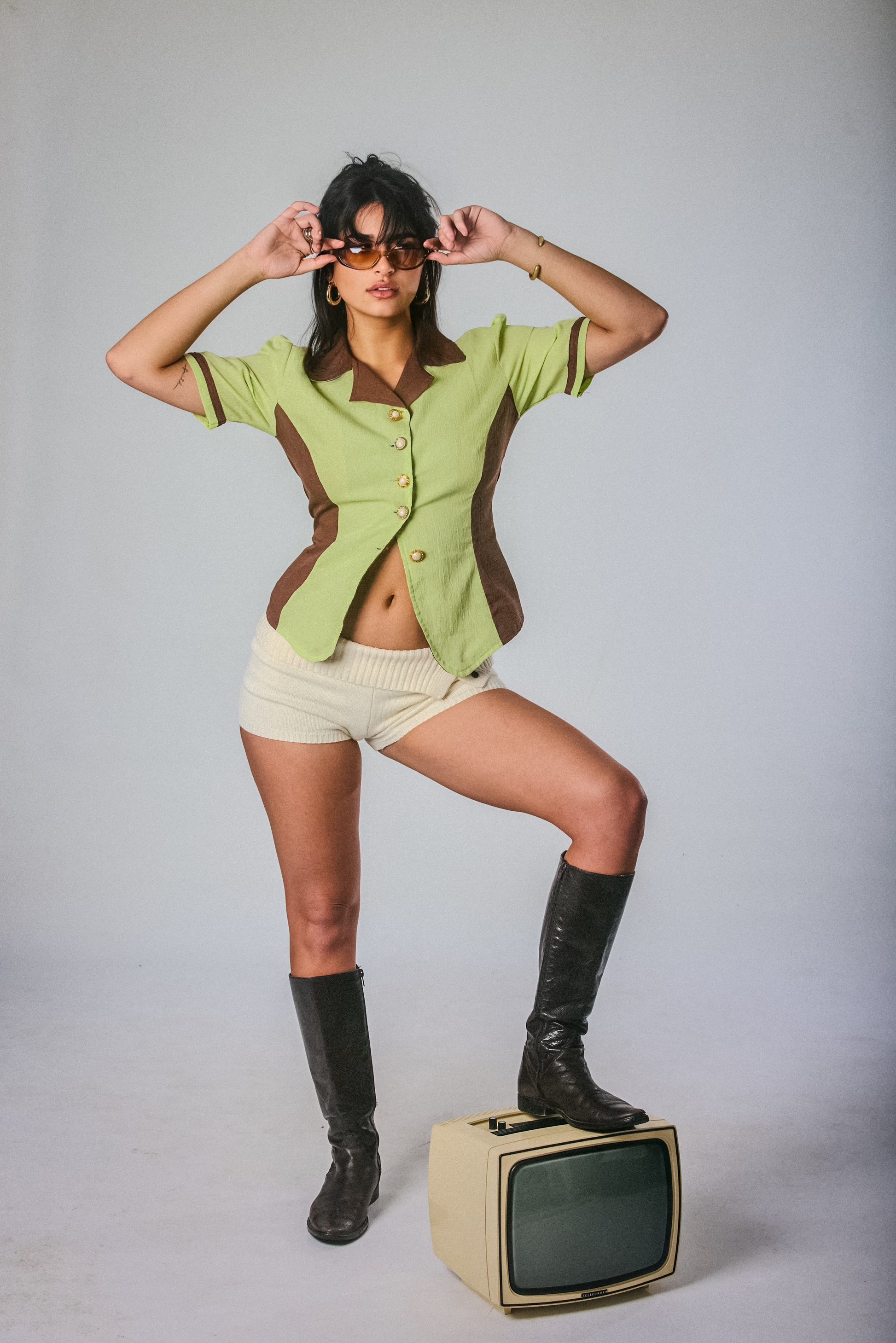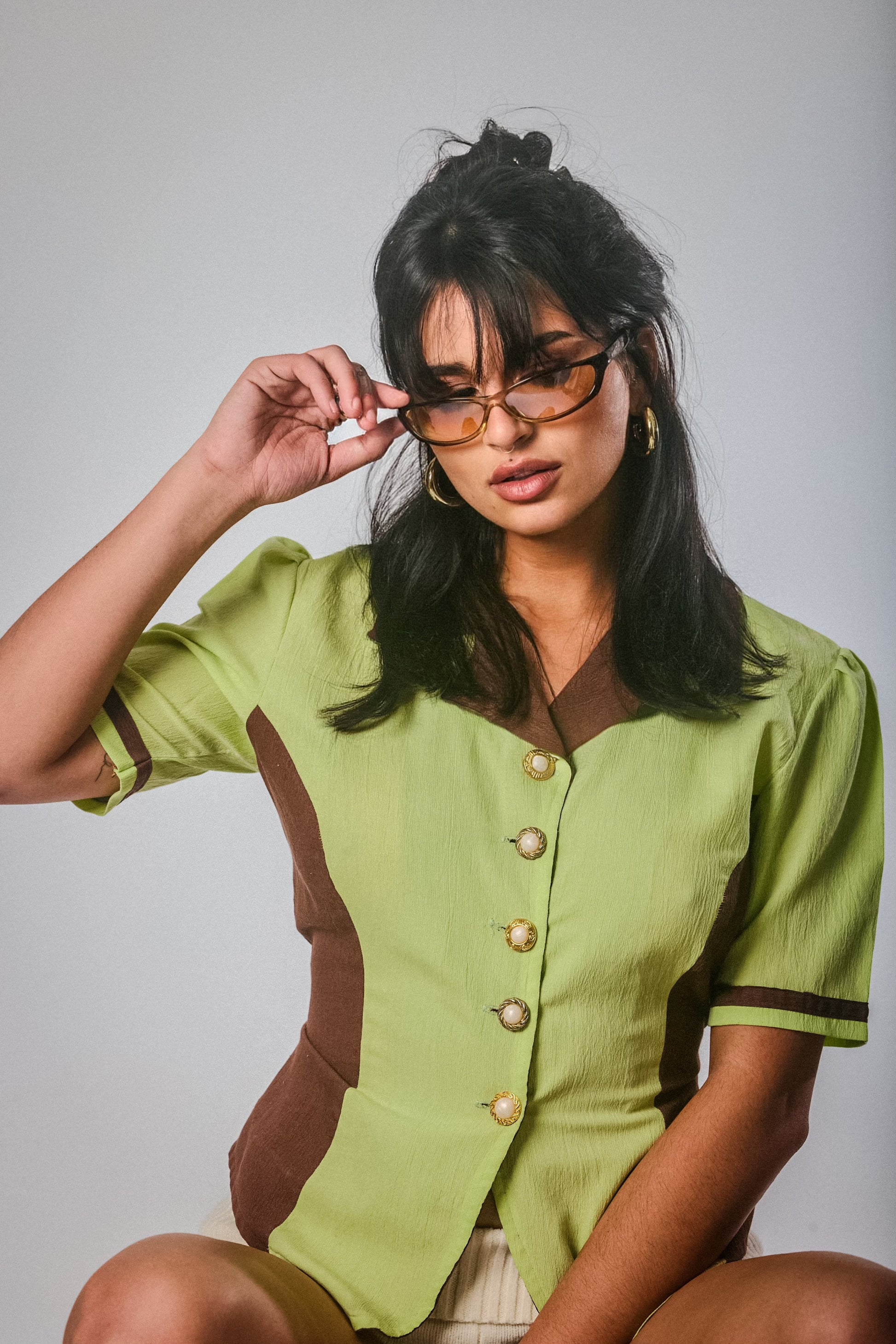 This structured two-tone shirt gives Y2K business baddie. Featuring gold pearl buttons, brown contrast panelling, and a tailored waist for a snatched fit. She’s vintage, she’s chic, she’s sharp—pair with cargos or knee-highs.