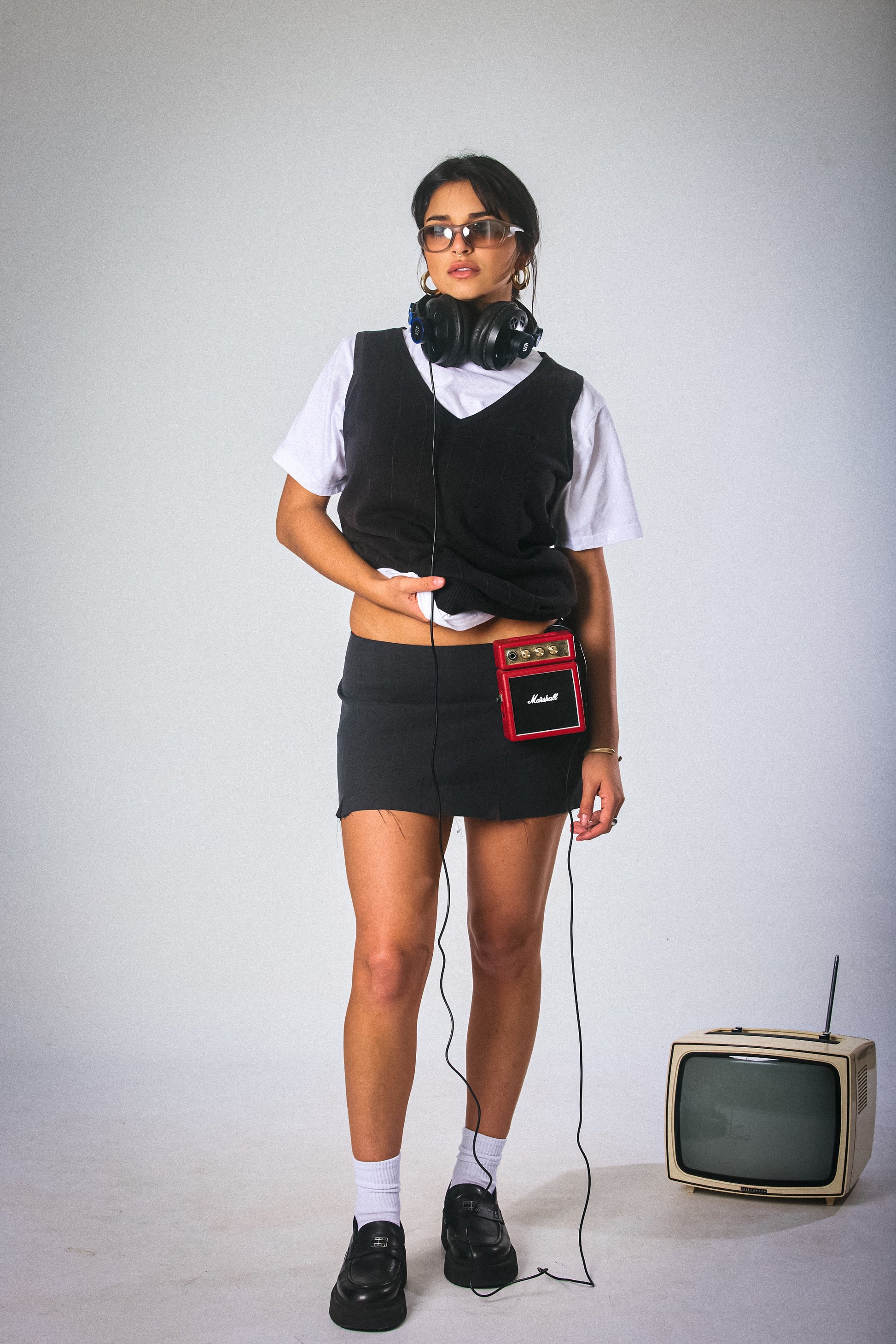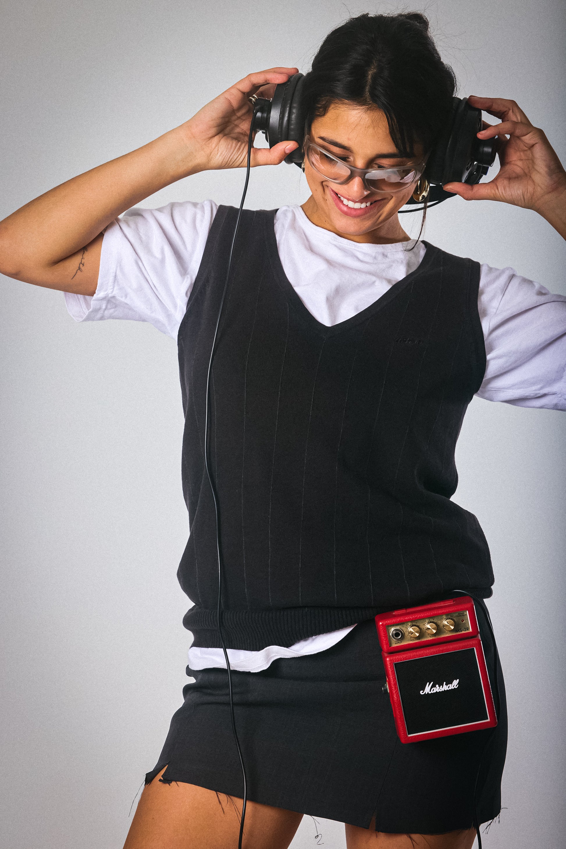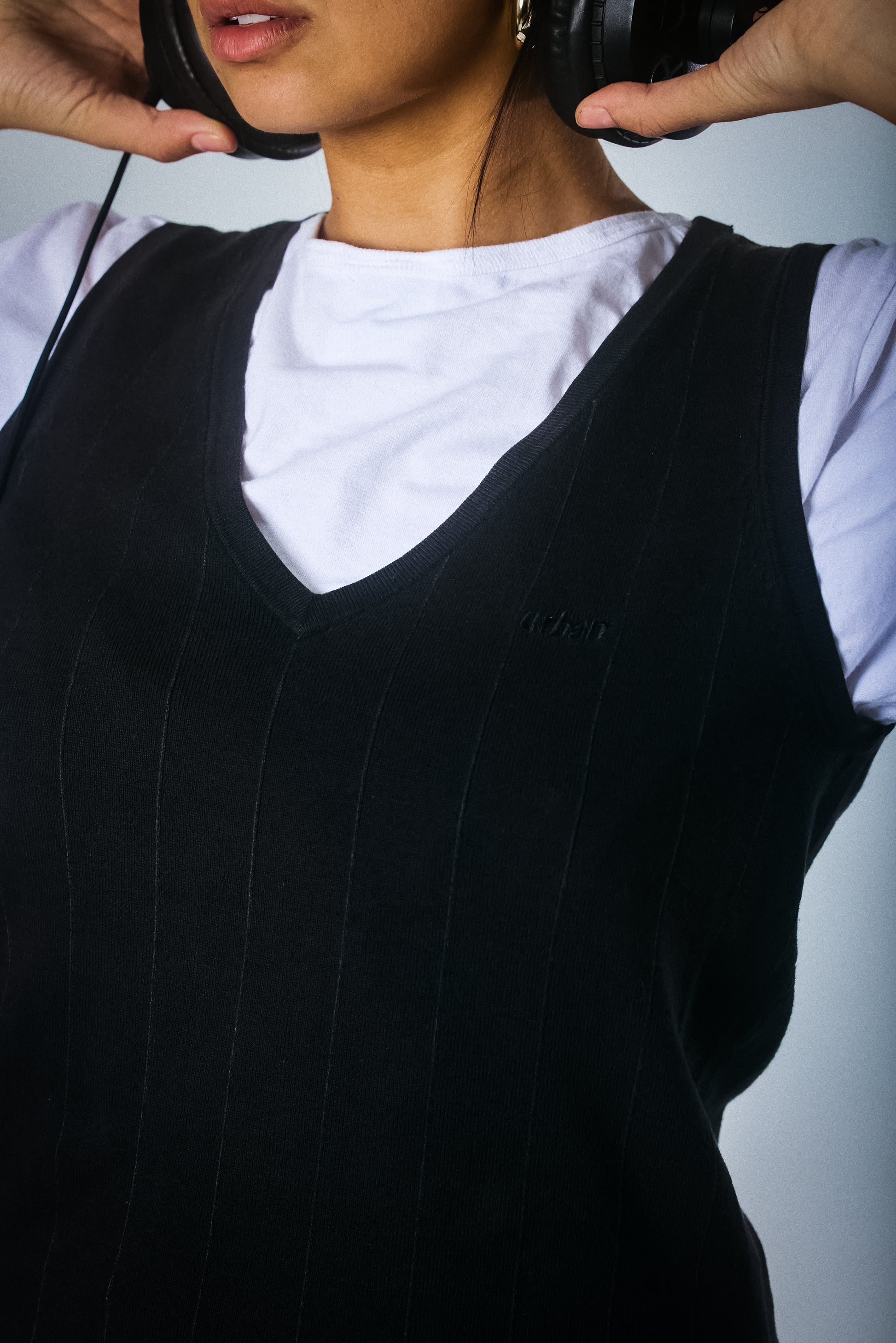 A vintage black sweater vest with subtle vertical ribbing and a sharp V-neckline. This piece by Urban is crafted in a soft, structured knit that layers seamlessly over tees, shirts, or bare skin. Tailored yet minimal, it’s the kind of staple that makes an outfit feel considered without trying too hard. A quiet essential for cool-season styling.