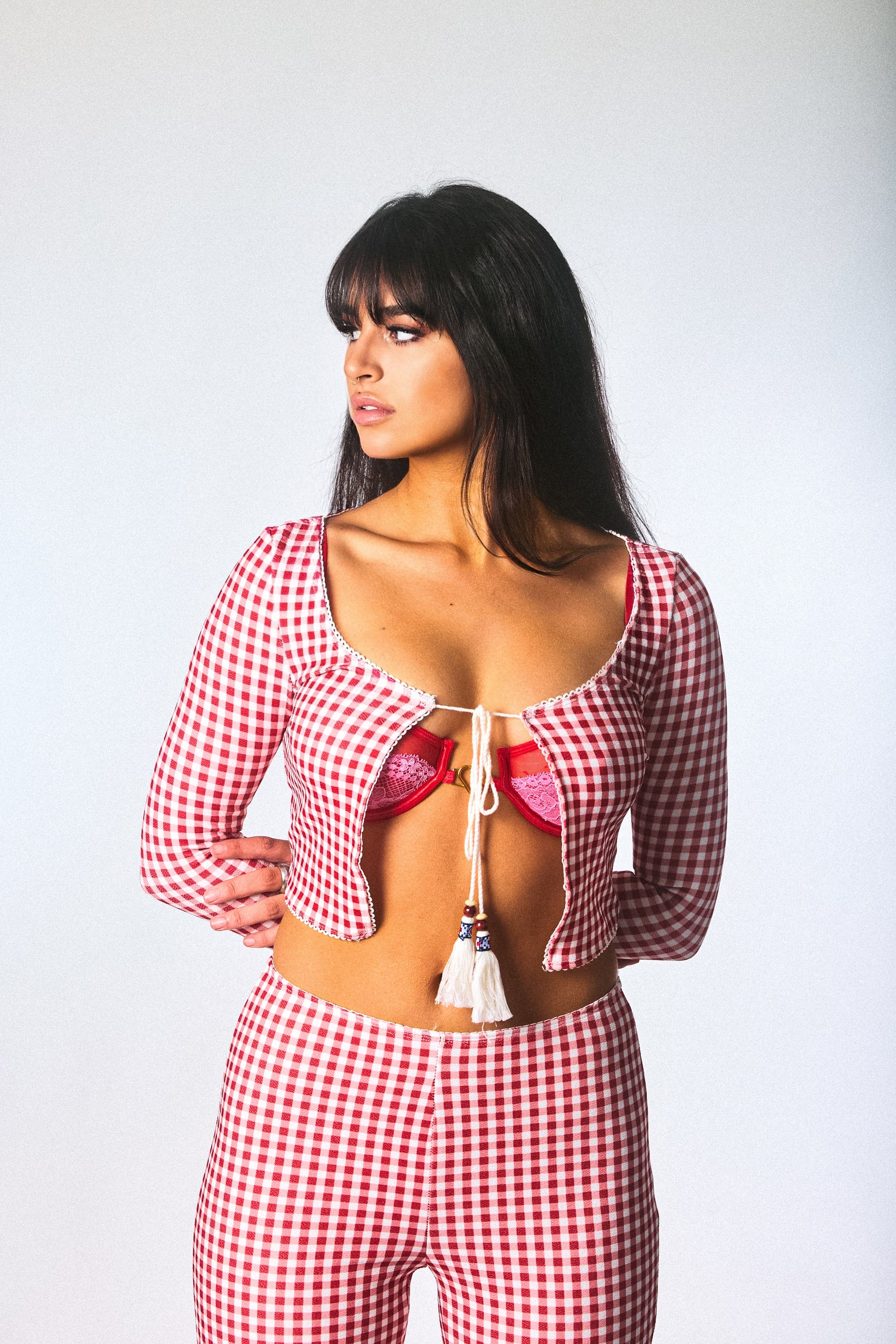 Stretchy gingham two-piece. Cropped tie-up top with tassel detail. Mid-rise capri pants with a snug fit. Feels like summer, styled for chaos.